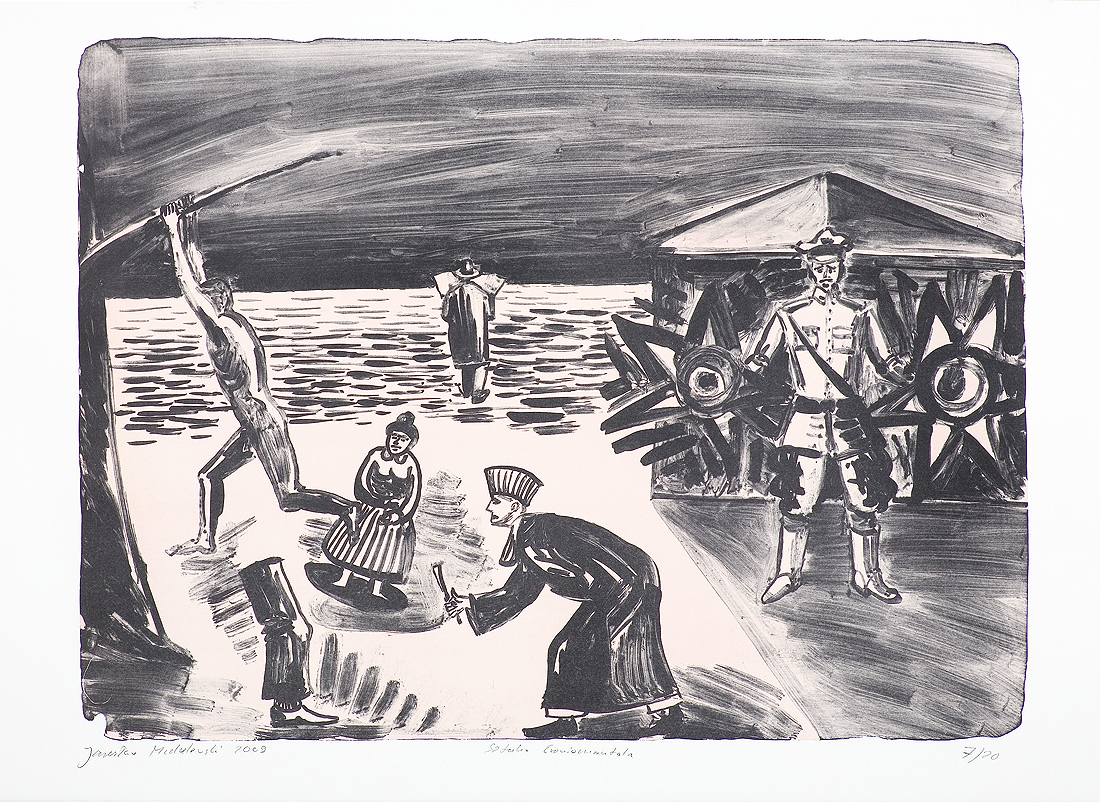 Jarosław Modzelewski (Warszawa 1955, mieszka w Warszawie) studiował malarstwo w ASP w Warszawie w latach 1975-1980, uzyskując dyplom w pracowni Stefana Gierowskiego. Od 1982 pracuje jako pedagog na macierzystym wydziale. W 1982 był współzałożycielem „Gruppy”, najważniejszego ugrupowania nurtu nowej ekspresji lat 80., działającego do 1992. W latach 1991-1996 wspólnie z Markiem Sobczykiem prowadził prywatną Szkołę Sztuki w Warszawie. Od wielu lat współpracuje z Galerią Zderzak w Krakowie. W początkowym okresie twórczości skłaniał się ku abstrakcji, wykorzystywał uproszczone znaki i emblematy oraz sylwetki odbite z szablonu. W 1985 namalował cykl oparty na ilustracjach do podręczników języka rosyjskiego, obrazujący proste czynności, których czasownikowe określenia stanowią tytuły prac. W 1986-1989 powstawały obrazy utrzymane w konwencji realistycznej, jednak zarazem o surrealnej atmosferze uzyskiwanej różnymi metodami, np. przez dublowanie figur, ukazywanie postaci w sytuacji niepewności czy zagrożenia, zabiegi z przestrzenią. W grupie obrazów z 1988 artysta rezygnuje z postaci ludzkiej na rzecz wyjątkowego nasycenia emocją samej przestrzeni pejzaży i wnętrz. Około 1990 wraca do kompozycji akcentujących czynności wykonywane przez postaci, które często umieszczone są w pustej, zaledwie zasugerowanej, acz dominującej przestrzeni. Odrealnienia i monumentalności dodaje tym obrazom płaskie i rozległe kładzenie koloru.