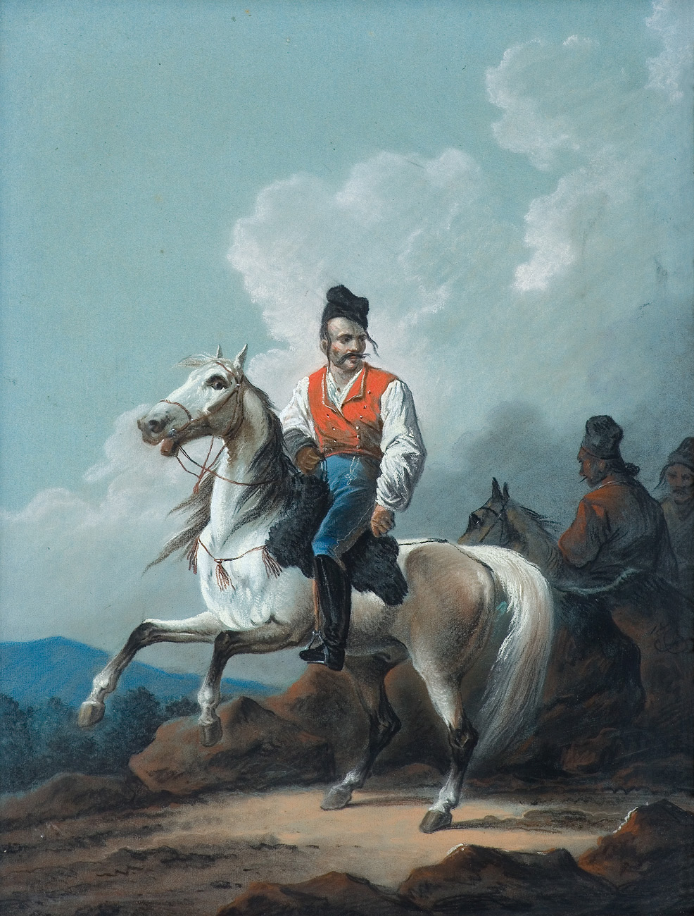 Aleksander Orłowski (Warszawa 1777 – Petersburg 1832) - malarz, rysownik i grafik. Protegowany księżnej Izabelli Czartoryskiej, w latach 1793-1801 kształcił się w pracowni J. P. Norblina, który wywarł zasadniczy wpływ na całą jego późniejszą twórczość. Dorywczo uczył się także w zamkowej „malarni” M. Bacciarellego, u miniaturzysty W. de Lesseura i sztycharza B. Folino. Brał udział w powstaniu kościuszkowskim. Okresowo pracował dla ks. Józefa Poniatowskiego i dla ks. Heleny Radziwiłłowej. W roku 1802 wyjechał na Litwę, a stamtąd do Petersburga, gdzie zamieszkał na stałe, zyskując wkrótce ogromną popularność. Został nadwornym rysownikiem wielkiego księcia Konstantego, pracował też dla cesarza Aleksandra I. W roku 1809 otrzymał tytuł akademika petersburskiej Akademii Sztuk Pięknych. Był przede wszystkim rysownikiem, chętnie malował też pastelami i olejno. Tematyka jego prac była różnorodna: tworzył sceny batalistyczne, rysował i malował wschodnich jeźdźców, charakterystyczne typy ludowe, sceny z życia wsi, pejzaże, portrety i karykatury. Od 1816 zajmował się litografią, popularyzując tę technikę na terenie Rosji. Był wybitną postacią polskiej kolonii artystycznej w Petersburgu. Z podziwem pisał o Orłowskim Aleksander Puszkin, odnajdujący w jego sztuce cechy bliskie własnym, romantycznym ideałom, a zaprzyjaźniony z nim Adam Mickiewicz w „Panu Tadeuszu” kilka wierszy poświęcił „naszemu malarzowi Orłowskiemu”, który mimo, że „życie strawił w Peterburku | Sławny malarz (mam jego kilka szkiców w biurku),| Mieszkał tuż przy cesarzu, na dworze, jak w raju,| A nie uwierzy Hrabia, jak tęsknił po kraju,| Lubił ciągle wspominać swej młodości czasy,| Wysławiał wszystko w Polszcze: ziemię, niebo, lasy...”