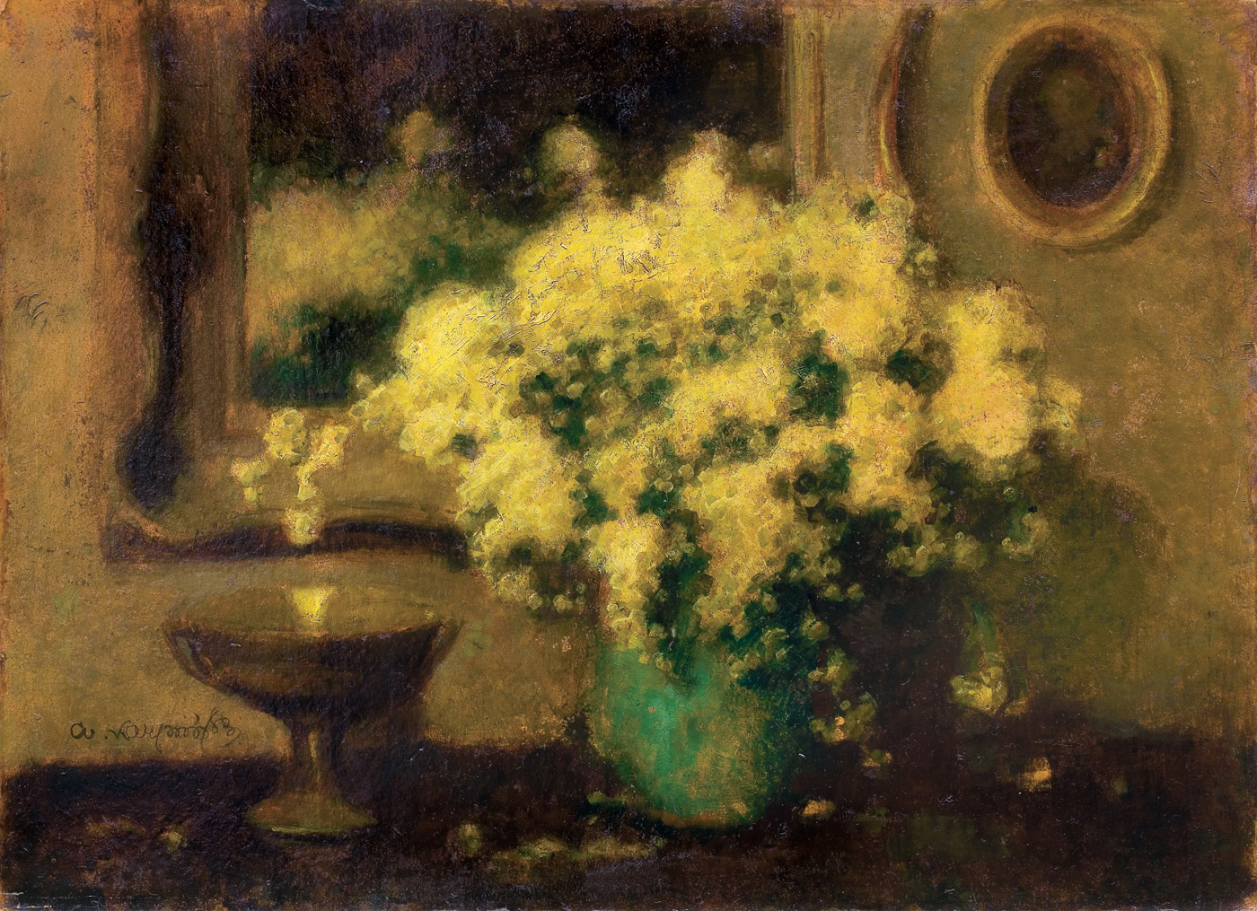 Alfons Karpiński (Rozwadów, dziś dzielnica Stalowej Woli 1875 - Kraków 1961) w latach 1891-1899 studiował w krakowskiej Szkole Sztuk Pięknych pod kierunkiem Floriana Cynka, Izydora Jabłońskiego, Władysława Łuszczkiewicza i Leona Wyczółkowskiego, a następnie kształcił się jeszcze u Antona Ažbégo w Monachium (1903), u Kazimierza Pochwalskiego w Wiedniu, a od 1907 także w Paryżu. Podróżował do Włoch i Londynu. Stale mieszkał w Krakowie; związany z tamtejszym środowiskiem skupionym wokół „Zielonego Balonika” projektował dekoracje do przedstawień kabaretu. Należał do Tow. Artystów Polskich „Sztuka”, grupy „Zero”, był członkiem wiedeńskiego stowarzyszenia „Secesja” i krakowskiego TPSP. Uczestniczył w wielu wystawach w kraju i za granicą. W czasie I wojny światowej służył w armii austriackiej. Na bogatą twórczość artysty składają się wczesne sceny rodzajowe z podkrakowskiej wsi, pejzaże i portrety, wśród nich zwłaszcza portrety kobiece, które przyniosły mu szczególną popularność. Z czasem głównym – obok portretu – tematem jego obrazów stały się martwe natury z kwiatami, dekoracyjne kompozycje o stonowanej gamie barwnej. Artysta zajmował się także grafiką i ilustratorstwem.