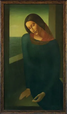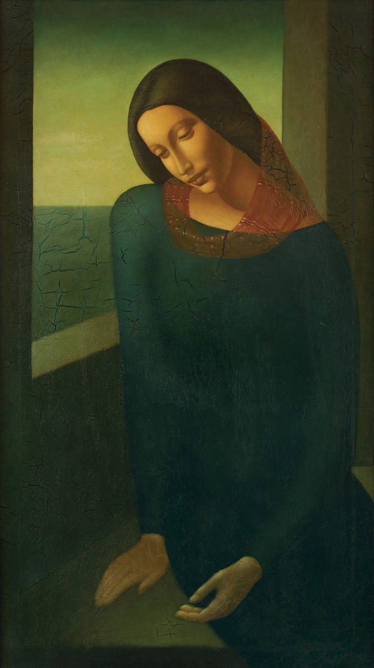 Roman Zakrzewski (Oświęcim 1955- Kraków 2014) ukończył krakowską ASP w 1985. Wystawiał swe prace w galeriach promujących sztukę tzw. realizmu magicznego, m.in. w Galerii Katarzyny Napiórkowskiej w Warszawie i w domach aukcyjnych. Artysta, inspirujący się ewidentnie sztuką Amadeo Modiglianiego i malarstwem epok gotyku i Quattrocenta, opracowuje na różne sposoby jeden temat – wizerunek siedzącej en face lub en trois quatre dziewczyny o wydłużonej sylwetce, ubranej w wąską suknię o dekoracyjnym wzorze. Przez okno w tle roztacza się widok na rozległy, ujęty z lotu ptaka pejzaż.