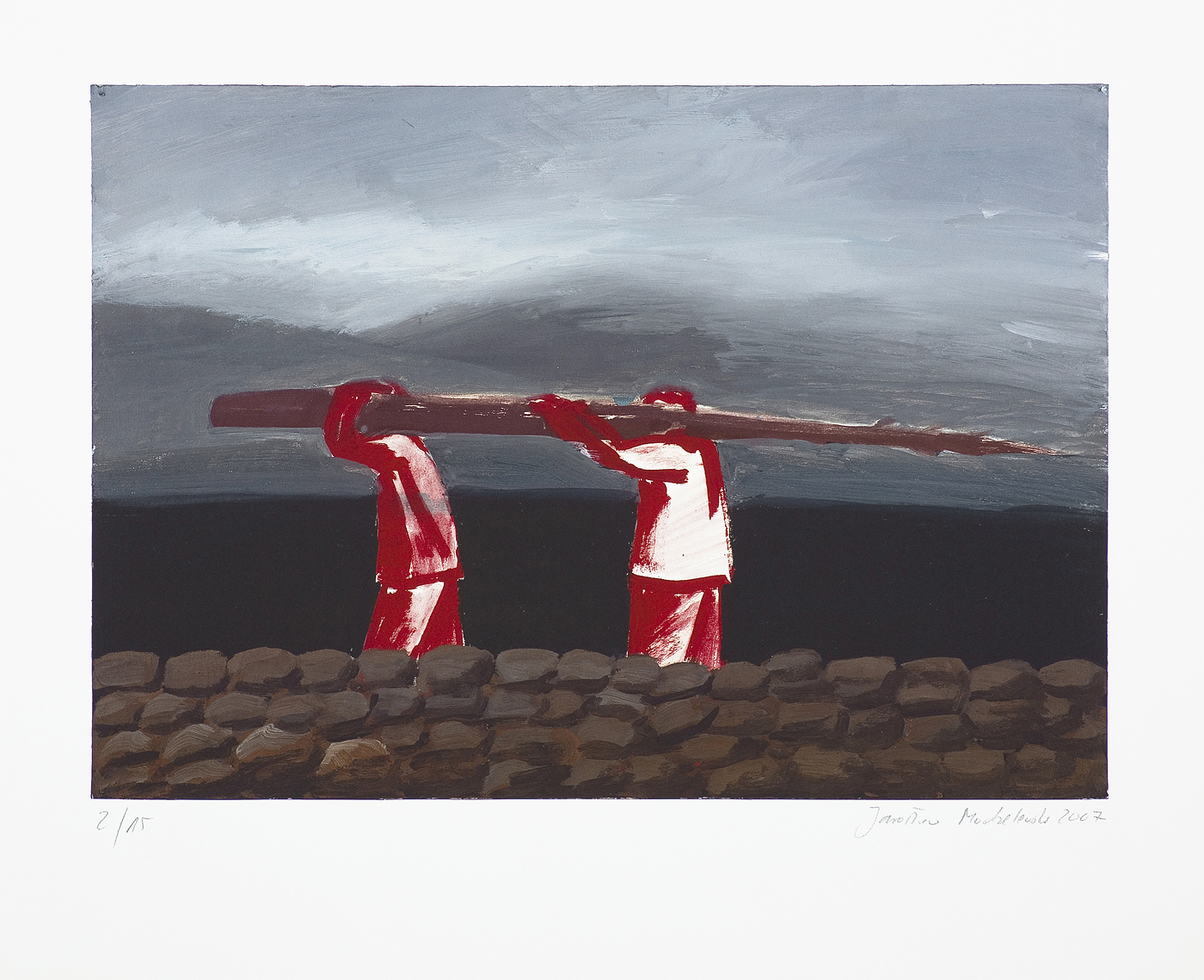 Jarosław Modzelewski (Warszawa 1955, mieszka w Warszawie) studiował malarstwo w ASP w Warszawie w latach 1975-1980, uzyskując dyplom w pracowni Stefana Gierowskiego. Od 1982 pracuje jako pedagog na macierzystym wydziale. W 1982 był współzałożycielem „Gruppy”, najważniejszego ugrupowania nurtu nowej ekspresji lat 80., działającego do 1992. W latach 1991-1996 wspólnie z Markiem Sobczykiem prowadził prywatną Szkołę Sztuki w Warszawie. Od wielu lat współpracuje z Galerią Zderzak w Krakowie. W początkowym okresie twórczości skłaniał się ku abstrakcji, wykorzystywał uproszczone znaki i emblematy oraz sylwetki odbite z szablonu. W 1985 namalował cykl oparty na ilustracjach do podręczników języka rosyjskiego, obrazujący proste czynności, których czasownikowe określenia stanowią tytuły prac. W 1986-1989 powstawały obrazy utrzymane w konwencji realistycznej, jednak zarazem o surrealnej atmosferze uzyskiwanej różnymi metodami, np. przez dublowanie figur, ukazywanie postaci w sytuacji niepewności czy zagrożenia, zabiegi z przestrzenią. W grupie obrazów z 1988 artysta rezygnuje z postaci ludzkiej na rzecz wyjątkowego nasycenia emocją samej przestrzeni pejzaży i wnętrz. Około 1990 wraca do kompozycji akcentujących czynności wykonywane przez postaci, które często umieszczone są w pustej, zaledwie zasugerowanej, acz dominującej przestrzeni. Odrealnienia i monumentalności dodaje tym obrazom płaskie i rozległe kładzenie koloru.