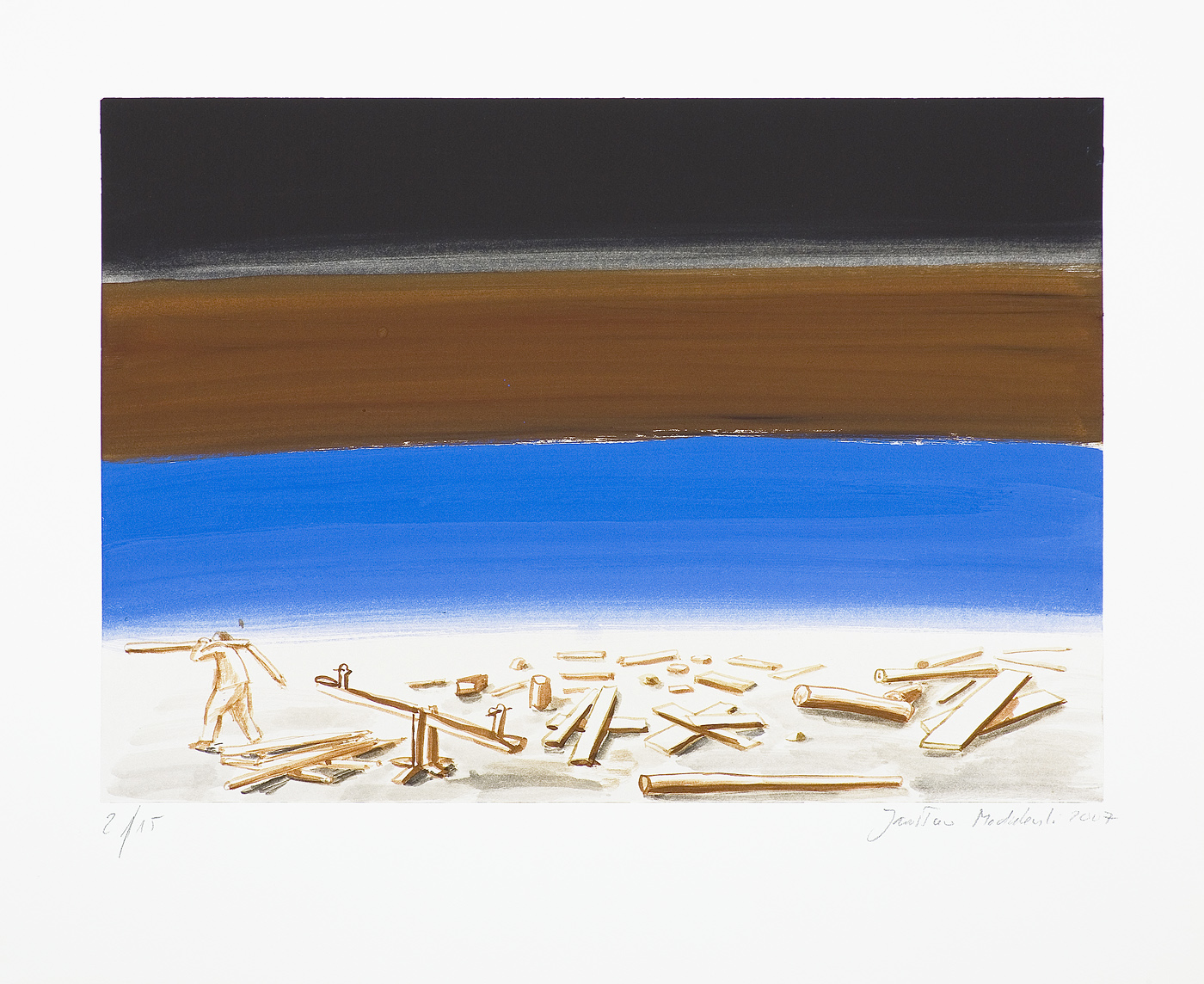 Jarosław Modzelewski (Warszawa 1955, mieszka w Warszawie) studiował malarstwo w ASP w Warszawie w latach 1975-1980, uzyskując dyplom w pracowni Stefana Gierowskiego. Od 1982 pracuje jako pedagog na macierzystym wydziale. W 1982 był współzałożycielem „Gruppy”, najważniejszego ugrupowania nurtu nowej ekspresji lat 80., działającego do 1992. W latach 1991-1996 wspólnie z Markiem Sobczykiem prowadził prywatną Szkołę Sztuki w Warszawie. Od wielu lat współpracuje z Galerią Zderzak w Krakowie. W początkowym okresie twórczości skłaniał się ku abstrakcji, wykorzystywał uproszczone znaki i emblematy oraz sylwetki odbite z szablonu. W 1985 namalował cykl oparty na ilustracjach do podręczników języka rosyjskiego, obrazujący proste czynności, których czasownikowe określenia stanowią tytuły prac. W 1986-1989 powstawały obrazy utrzymane w konwencji realistycznej, jednak zarazem o surrealnej atmosferze uzyskiwanej różnymi metodami, np. przez dublowanie figur, ukazywanie postaci w sytuacji niepewności czy zagrożenia, zabiegi z przestrzenią. W grupie obrazów z 1988 artysta rezygnuje z postaci ludzkiej na rzecz wyjątkowego nasycenia emocją samej przestrzeni pejzaży i wnętrz. Około 1990 wraca do kompozycji akcentujących czynności wykonywane przez postaci, które często umieszczone są w pustej, zaledwie zasugerowanej, acz dominującej przestrzeni. Odrealnienia i monumentalności dodaje tym obrazom płaskie i rozległe kładzenie koloru.