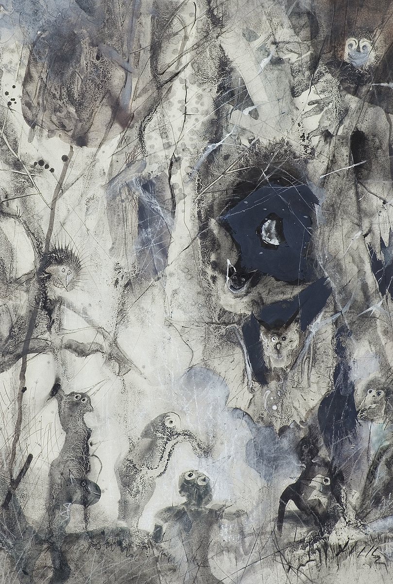 tusz pędzel, pastel, akwarela, długopis, papier
