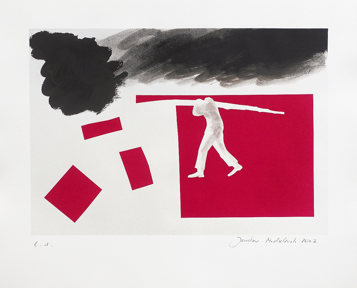 Jarosław Modzelewski (Warszawa 1955, mieszka w Warszawie) studiował malarstwo w ASP w Warszawie w latach 1975-1980, uzyskując dyplom w pracowni Stefana Gierowskiego. Od 1982 pracuje jako pedagog na macierzystym wydziale. W 1982 był współzałożycielem „Gruppy”, najważniejszego ugrupowania nurtu nowej ekspresji lat 80., działającego do 1992. W latach 1991-1996 wspólnie z Markiem Sobczykiem prowadził prywatną Szkołę Sztuki w Warszawie. Od wielu lat współpracuje z Galerią Zderzak w Krakowie. W początkowym okresie twórczości skłaniał się ku abstrakcji, wykorzystywał uproszczone znaki i emblematy oraz sylwetki odbite z szablonu. W 1985 namalował cykl oparty na ilustracjach do podręczników języka rosyjskiego, obrazujący proste czynności, których czasownikowe określenia stanowią tytuły prac. W 1986-1989 powstawały obrazy utrzymane w konwencji realistycznej, jednak zarazem o surrealnej atmosferze uzyskiwanej różnymi metodami, np. przez dublowanie figur, ukazywanie postaci w sytuacji niepewności czy zagrożenia, zabiegi z przestrzenią. W grupie obrazów z 1988 artysta rezygnuje z postaci ludzkiej na rzecz wyjątkowego nasycenia emocją samej przestrzeni pejzaży i wnętrz. Około 1990 wraca do kompozycji akcentujących czynności wykonywane przez postaci, które często umieszczone są w pustej, zaledwie zasugerowanej, acz dominującej przestrzeni. Odrealnienia i monumentalności dodaje tym obrazom płaskie i rozległe kładzenie koloru.