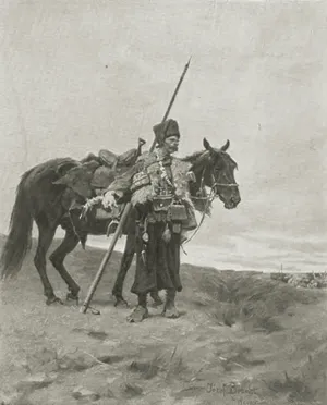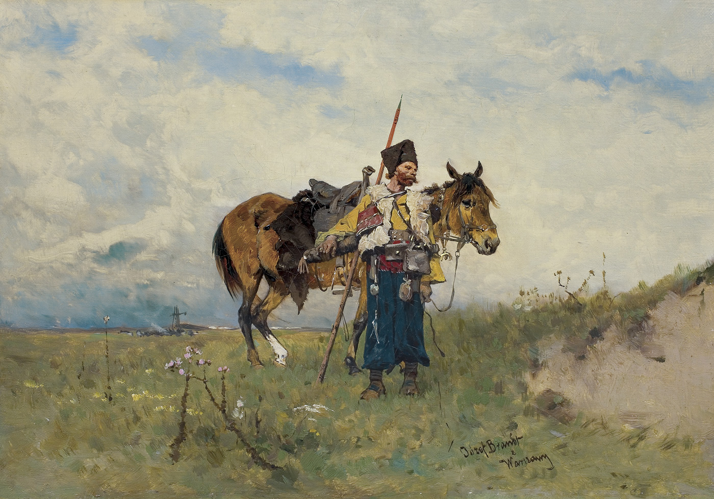 Józef Brandt (Szczebrzeszyn 1841 - Radom 1915) był jednym z najwybitniejszym polskich malarzy batalistów. Naukę malarstwa rozpoczął w Warszawie pod okiem Juliusza Kossaka. W latach 1858-1860 był w Paryżu, gdzie podjął studia inżynierskie. Niebawem zarzucił je jednak na rzecz malarstwa i kształcił się w pracowni Leona Cognieta. Po powrocie do kraju, w 1861 debiutował na wystawie w warszawskim TZSP. Od 1863 kontynuował studia w monachijskiej ASP u Franza Adama. W 1870 otworzył w Monachium własną pracownie i niebawem stał się przywódcą, „generałem” tamtejszej polskiej kolonii artystycznej i nauczycielem wielu malarzy. Po 1877 miesiące letnie spędzał w Orońsku, zapraszając na plenery grono swych uczniów. Został honorowym profesorem Akademii w Monachium (1878), członkiem Akademii w Berlinie (1877) i Pradze (1900). Odznaczony wysokimi orderami, wyróżniany medalami i nagrodami na międzynarodowych wystawach, cieszył się prawdziwie europejską sławą. Mieszkając i tworząc poza krajem zawsze wyraźnie podkreślał swoją polskość; dając jej wyraz choćby poprzez podpisywanie obrazów Józef Brandt z Warszawy. Malował bitwy, potyczki, podjazdy – epizody z historii polskich wojen kresowych i wojen szwedzkich XVII wieku, a także sceny rodzajowe – jeźdźców, polowania, jarmarki. Jego barwne, pełne ruchu i perfekcyjne warsztatowo obrazy podziwiano powszechnie, jako najlepszy przykład wysoko wówczas cenionej „szkoły polskiej”. Ale podczas gdy niemiecki czy francuski widz dostrzegał w nich przede wszystkim egzotykę i barwy Orientu, dla Polaków były to płótna „prawdziwe, naturalne, swojskie jak fragmenty z pamiętników Paska albo Rzewuskiego, przetransponowane na barwy i linie”. |