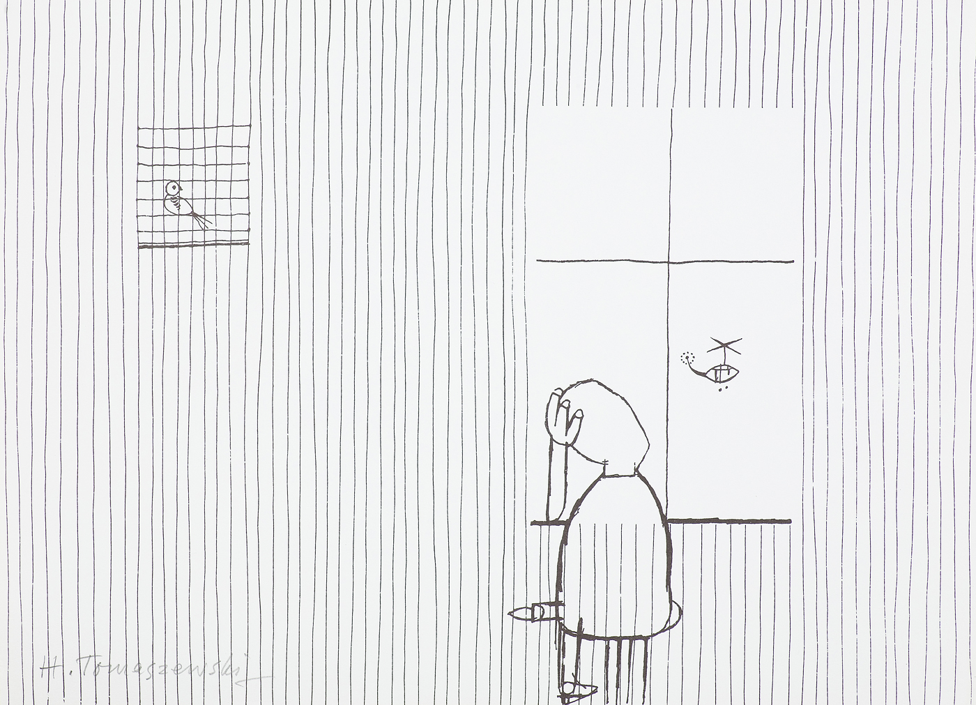 Henryk Tomaszewski (Warszawa1914-Warszawa 2005) ukończył ASP w Warszawie w 1931. Główny okres jego twórczości przypada na lata powojenne, kiedy to stał się jednym z głównych przedstawicieli fenomenu tzw. polskiej szkoły plakatu. Tomaszewski położył tu zasługi podwójnie - jako twórca i jako pedagog, pod którego opieką kształcili się młodsi plakaciści i graficy użytkowi tego nurtu. Indywidualny styl plakatów Tomaszewskiego, trudny do zdefiniowania, choć wyraziście odróżniający jego prace od innych, bazuje na trafnej metaforze, podanej lekkim, pełnym finezji i humoru rysunkiem oraz szczególnie starannie i adekwatnie do tematu opracowanym liternictwem. Twórczość plakatowa przyniosła artyście wiele nagród, poczynając od pięciu złotych medali zdobytych na Międzynarodowej Wystawie Plakatu w Wiedniu (1948), poprzez I nagrodę na VIII Biennale Sztuki w Sao Paulo (1963), I nagrodę na Międzynarodowej Wystawie Plakatu w Fort Collins, USA (1981), po złoty i srebrny medal na XII Międzynarodowym Biennale Plakatu w Warszawie (1988). Artysta otrzymał również nagrodę Fundacji Alfreda Jurzykowskiego (1984). Równolegle z plakatem tworzy rysunki, ilustracje, okładki książkowe itp., zawierając w nich (zwłaszcza w rysunkach) ogromny ładunek wyrafinowanego humoru i intelektualnej zabawy, gry słów i skojarzeń.