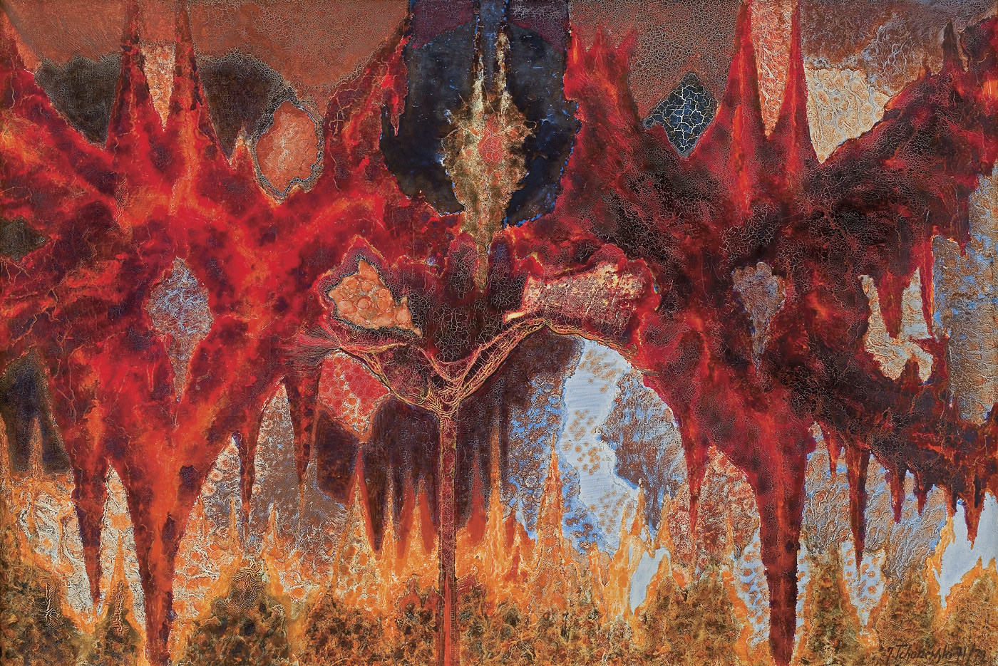 Jerzy Tchórzewski w czasie wojny walczył w AK. Studiował w ASP w Krakowie w latach 1946-1951. W czasie studiów związał się z kręgiem Grupy Krakowskiej. Debiutował na I Wystawie Sztuki Nowoczesnej w Krakowie w 1948, w 1955 uczestniczył w wystawie w warszawskim Arsenale, gdzie zdobył nagrodę. W tym czasie mieszkał już w Warszawie, gdzie w 1954 podjął pracę pedagogiczną w ASP (przeszedł na emeryturę w 1998). Już od wczesnego, figuratywnego okresu twórczości (1948-1955), kiedy umieszczał postaci i fantastyczne stwory w wyimaginowanych pejzażach, odznaczał się zainteresowaniami i typem wyobraźni bliskiej surrealizmowi. W drugiej połowie 50. zaczął malować abstrakcyjne obrazy nasuwające na myśl kosmiczne kataklizmy i erupcje materii, rozjaśniane poszarpanymi liniami błyskawic kontrastujących z ciemnym tłem. Niekiedy w jego kompozycjach pojawiały się kształty ludzkie i zwierzęce. Zbieżność surrealizujących wizji Tchórzewskiego z równoległymi tendencjami malarstwa informel sprawiła, że w 1959 stowarzyszył się z międzynarodowym ruchem artystycznym Phases. W późniejszych latach artysta komplikował fakturę obrazów, wykorzystując m.in. właściwości schnięcia grubej warstwy farby, a w przypadku gwaszy - efekty zmiętego papieru. Od końca lat 70. podejmował chętnie tematykę religijną. Apogeum tego nurtu przypadło na lata 80., kiedy artysta związał się z niezależnym ruchem artystycznym, wystawiając często w kościołach i na pokazach prywatnych. W 1986 otrzymał niezależną Nagrodę im. Jana Cybisa.