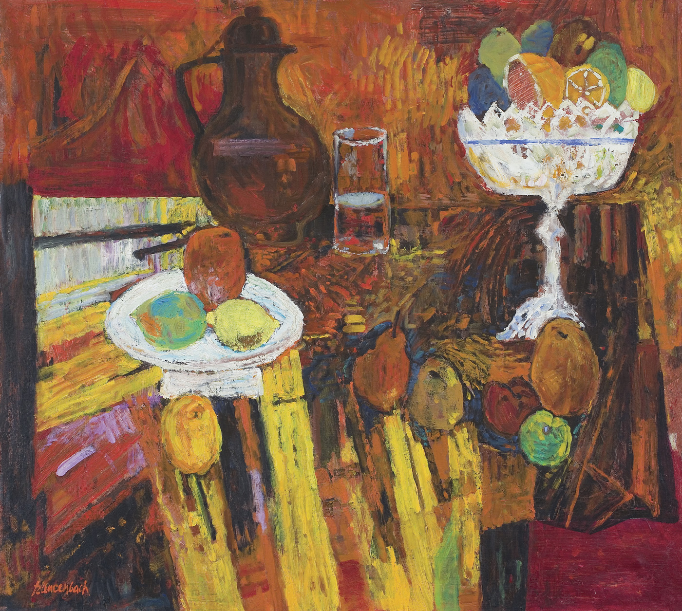 Jan Szancenbach (Kraków 1928 - Kraków 1998) studiował w latach 1940-1942 w Kunstgewerbeschule (czyli ASP zdegradowanej przez okupanta do roli szkoły zawodowej) pod kierunkiem m.in. Stanisława Kamockiego, Józefa Mehoffera, Andrzeja Jurkiewicza. Po zamknięciu uczelni, w latach 1942-1945 pracował zarobkowo i samodzielnie studiował. W 1945 został przyjęty ponownie na II rok studiów, które ukończył pod kierunkiem Eugeniusza Eibischa w 1948 (dyplom uzyskał w 1952). Od 1948 pracował jako asystent w macierzystej pracowni oraz w pracowni liternictwa i projektowania graficznego Ludwika Gardowskiego. Przeszedł wszystkie szczeble kariery akademickiej, od asystenta do profesora zwyczajnego (od 1986). Od 1972 prowadził własną katedrę na Wydziale Malarstwa. W latach 1987-1993 przez dwie kadencje był rektorem ASP w Krakowie. Jako malarz pozostawał wierny szkole koloryzmu polskiego, którego zasady przyswoił sobie w trakcie studiów u Eibischa. Jego malarstwo jest pełne światła i nasyconych barw, radosne, wręcz feeryczne. Obok wybitnych walorów kolorystycznych (zwłaszcza w czerwieniach malarz osiągał niezwykłą skalę odmian i odcieni) nie stroni od dekoratywizmu, co razem składa się na hedonistyczny, beztroski wyraz. Znany przede wszystkim jako twórca martwych natur, pejzaży, scen w ogrodach, Szancenbach zajmował się również malarstwem monumentalnym. Pracował m. in. przy renowacji Teatru im. Słowackiego w Krakowie oraz widowni i plafonu Opery we Wrocławiu. Innym wątkiem jego sztuki było projektowanie graficzne (znaki firmowe, plakaty, okładki, opakowania, etykiety, znaczki pocztowe itp.), zajmował się również ilustracją książkową i filmem rysunkowym.
