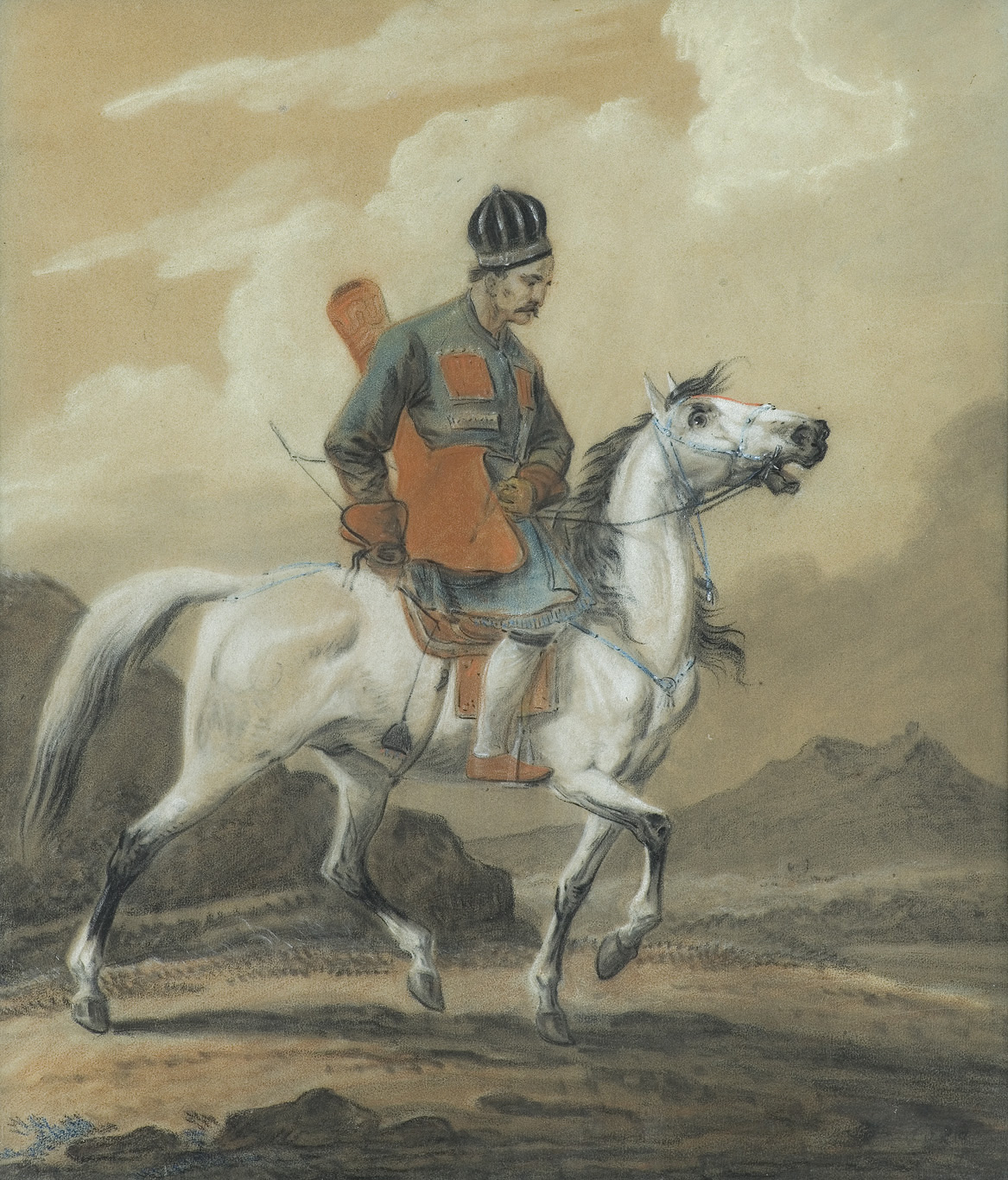 Aleksander Orłowski (Warszawa 1777 – Petersburg 1832) - malarz, rysownik i grafik. Protegowany księżnej Izabelli Czartoryskiej, w latach 1793-1801 kształcił się w pracowni J. P. Norblina, który wywarł zasadniczy wpływ na całą jego późniejszą twórczość. Dorywczo uczył się także w zamkowej „malarni” M. Bacciarellego, u miniaturzysty W. de Lesseura i sztycharza B. Folino. Brał udział w powstaniu kościuszkowskim. Okresowo pracował dla ks. Józefa Poniatowskiego i dla ks. Heleny Radziwiłłowej. W roku 1802 wyjechał na Litwę, a stamtąd do Petersburga, gdzie zamieszkał na stałe, zyskując wkrótce ogromną popularność. Został nadwornym rysownikiem wielkiego księcia Konstantego, pracował też dla cesarza Aleksandra I. W roku 1809 otrzymał tytuł akademika petersburskiej Akademii Sztuk Pięknych. Był przede wszystkim rysownikiem, chętnie malował też pastelami i olejno. Tematyka jego prac była różnorodna: tworzył sceny batalistyczne, rysował i malował wschodnich jeźdźców, charakterystyczne typy ludowe, sceny z życia wsi, pejzaże, portrety i karykatury. Od 1816 zajmował się litografią, popularyzując tę technikę na terenie Rosji. Był wybitną postacią polskiej kolonii artystycznej w Petersburgu. Z podziwem pisał o Orłowskim Aleksander Puszkin, odnajdujący w jego sztuce cechy bliskie własnym, romantycznym ideałom, a zaprzyjaźniony z nim Adam Mickiewicz w „Panu Tadeuszu” kilka wierszy poświęcił „naszemu malarzowi Orłowskiemu”, który mimo, że „życie strawił w Peterburku | Sławny malarz (mam jego kilka szkiców w biurku),| Mieszkał tuż przy cesarzu, na dworze, jak w raju,| A nie uwierzy Hrabia, jak tęsknił po kraju,| Lubił ciągle wspominać swej młodości czasy,| Wysławiał wszystko w Polszcze: ziemię, niebo, lasy...”