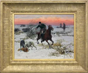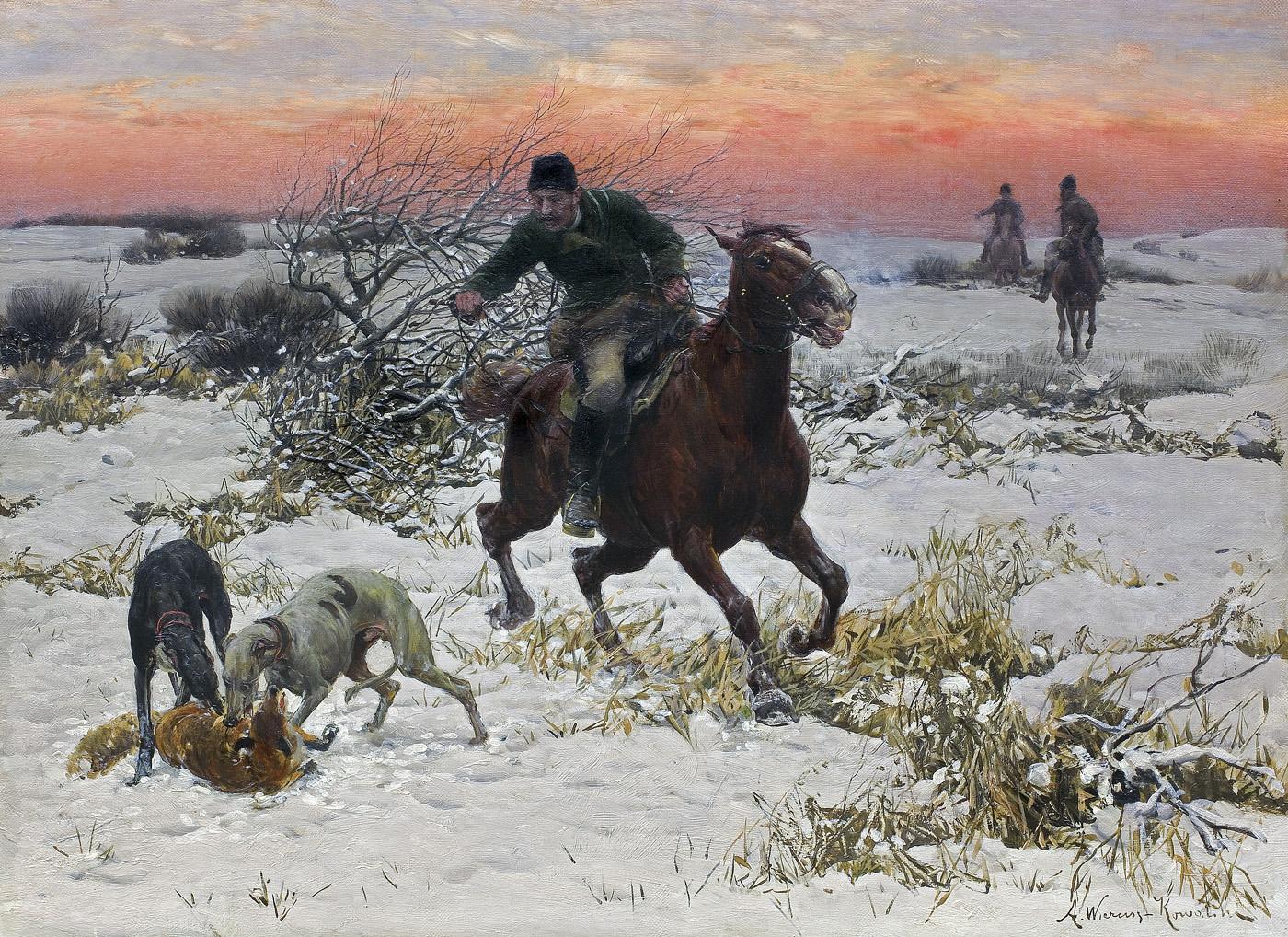 Alfred Wierusz-Kowalski (Suwałki 1849 – Monachium 1915) - jeden z najwybitniejszych polskich malarzy tzw. szkoły monachijskiej był, obok Józefa Brandta i Władysława Czachórskiego, także najpopularniejszym z polskich artystów osiadłych i stale działających w Monachium. Zamieszkał tam w roku 1873, już po studiach w Warszawie i w Dreźnie. Przez rok uczył się jeszcze w monachijskiej Akademii Sztuk Pięknych pod kierunkiem Alexandra Wagnera, a następnie przeniósł się do prywatnej pracowni Brandta. Uznanie krytyki i publiczności zdobył wcześnie; jego obrazy, odznaczane medalami na wystawach były rozchwytywane przez kolekcjonerów i niemieckich handlarzy. W roku 1890 został honorowym profesorem Akademii monachijskiej. Malował sceny rodzajowe i rodzajowo-historyczne z motywami jeźdźców, rycerzy, myśliwych, koni, wilków i śniegów. Po podróży do Afryki w roku 1903 podejmował też tematy orientalne. W polskich zbiorach muzealnych znalazło się stosunkowo niewiele prac artysty – jego obrazy sprzedawane głównie na rynku niemieckim w większej liczbie trafiały do kolekcji prywatnych, głównie w Niemczech i Stanach Zjednoczonych. Obecne często pojawiają się i na polskim rynku sztuki, zawsze budząc zainteresowanie kolekcjonerów.