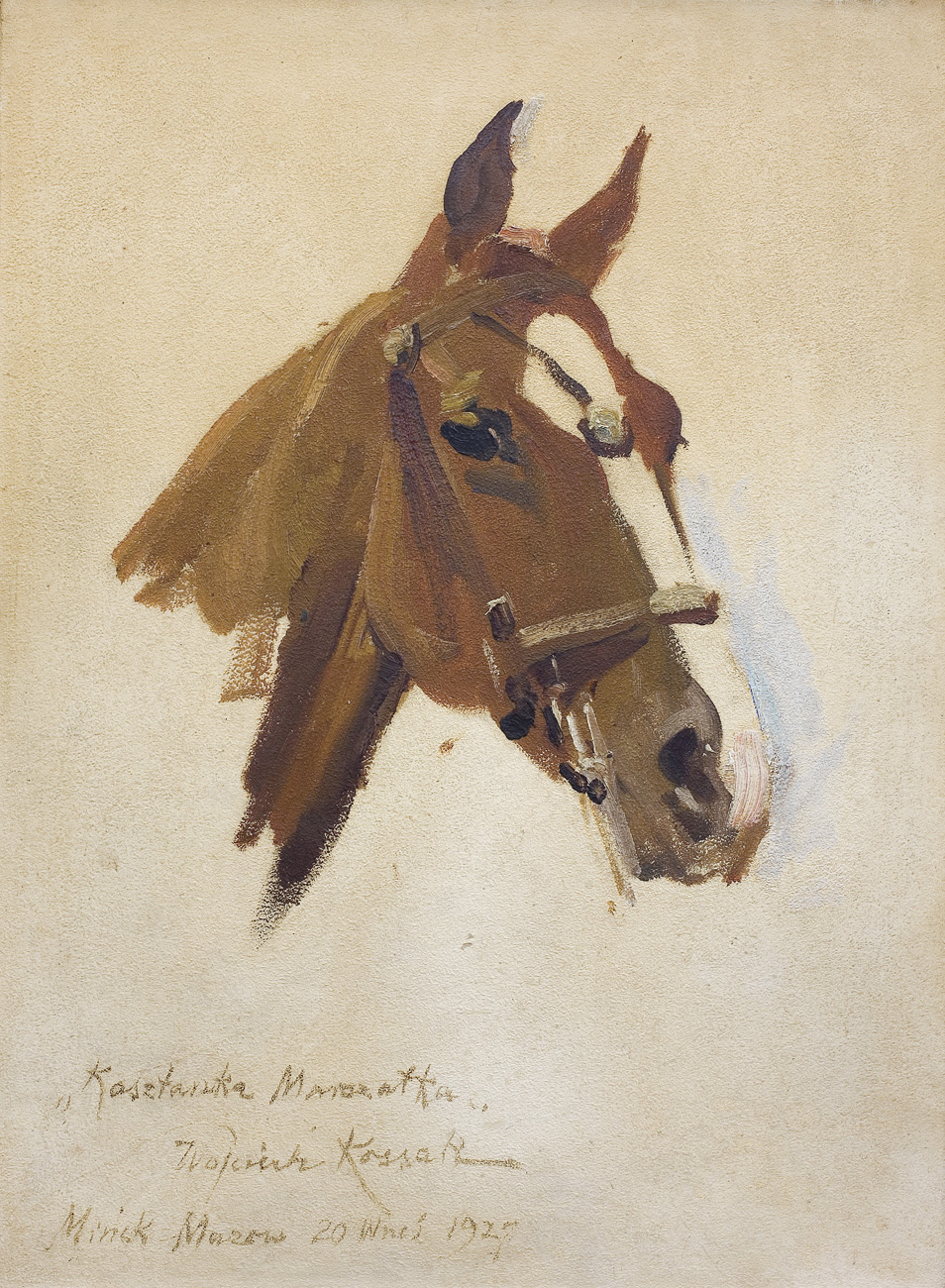 Wojciech Kossak (Paryż 1856 - Kraków 1942 ) – powszechnie znany malarz, postrzegany przede wszystkim jako świetny batalista. Syn i uczeń Juliusza Kossaka kształcił się w krakowskiej Szkole Sztuk Pięknych, w Akademii monachijskiej oraz w Paryżu. W latach 1895-1902 przebywał głównie w Berlinie, pracując dla cesarza Wilhelma II. Wiele podróżował, m.in. do Hiszpanii i Egiptu, gdzie wykonywał szkice do zamierzonych panoram. W późniejszych latach kilkakrotnie wyjeżdżał do Stanów Zjednoczonych wykonując zamówienia portretowe. W 1913 był mianowany profesorem warszawskiej Szkoły Sztuk Pięknych. W latach I wojny światowej pełnił służbę wojskową. Był współautorem panoram: „Racławice” (1893-1894), „Berezyna” (1895-1896), „Bitwa pod piramidami” (1901) oraz szkiców do niezrealizowanej „Somosierry” (1900). Z temperamentem i swobodą tworzył szeroko malowane, dynamiczne sceny batalistyczne, historyczne, rodzajowe oraz liczne portrety. Z upodobaniem malował konie. Jego obrazy, gloryfikujące dawne i współczesne artyście polskie wojsko i bohaterstwo żołnierzy, trafiały do patriotycznych uczuć odbiorców i cieszyły się ogromna popularnością.