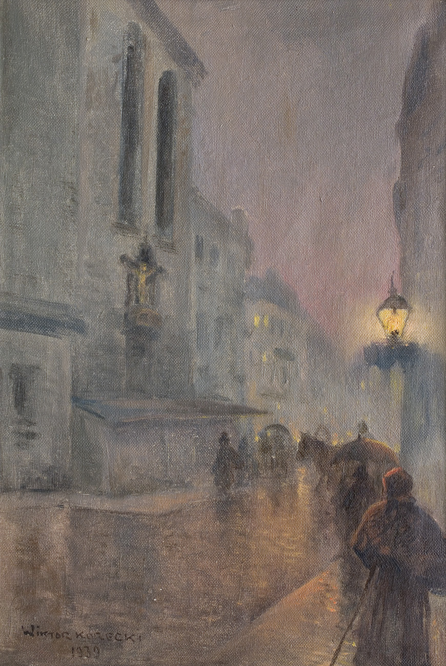 Wiktor Korecki (Kamieniec Podolski 1890 - Komorów k. Warszawy 1980) - malarz pejzażysta - gimnazjum ukończył w Kijowie, tam też studiował w Szkole Rysunkowej Aleksandra Muraszki. Po studiach wrócił do Kamieńca Podolskiego, skąd w roku 1921 wyjechał do Warszawy. Tu miał pracownię na rogu ulic Tamki i Cichej. Niestety zgromadzone tam obrazy spłonęły w czasie powstania 1944 roku. Po powstaniu artysta przebywał w obozie w Pruszkowie skąd trafił do obozu pracy w Lipsku. Do kraju powrócił w roku 1946 i zamieszkał w Komorowie pod Warszawą, a później w Milanówku. Jego nastrojowe krajobrazy emanujące spokojem i pogodą cieszyły się zawsze dużą popularnością. Korecki najczęściej malował pejzaże zimowe z motywem leśnej drogi i strumienia wijącego się wśród śniegów, a obok nich także wiosenne, letnie czy jesienne widoki z Mazowsza.