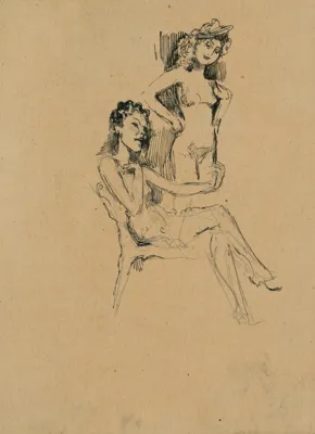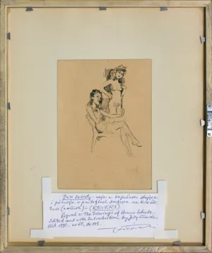 Szkic dwóch postaci kobiecych z rysunku na awersie, a później w ilustracji do – wzmiankowanego obok – wydania Sanatorium pod klepsydrą (s. 225).