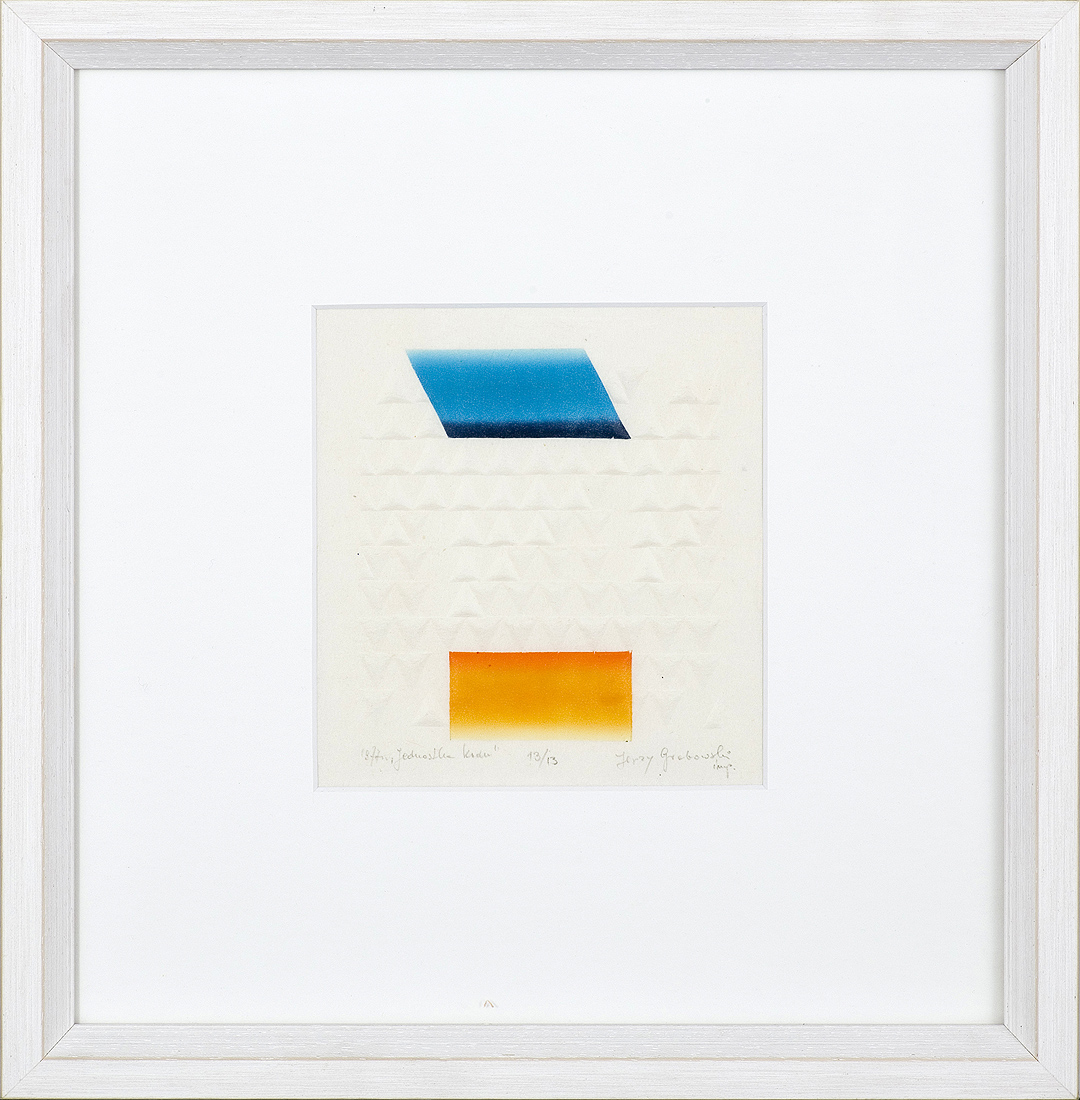Jerzy Grabowski (ur. Gutki koło Łomży 26.IX.1933) w latach 1953-1962 studiował początkowo na Wydziale Architektury Politechniki we Wrocławiu, następnie na Wydziale Grafiki ASP w Warszawie. Dyplom w pracowni prof. Józefa Mroszczaka. Od roku 1976 był pedagogiem w PWSSP w Łodzi prowadząc pracownię druków płaskich. Od roku 1993 wykładał w Europejskiej Akademi Sztuk w Warszawie. Juror międzynarodowych biennale i konkursów, członek Międzynarodowego Stowarzyszenia Drzeworytników XYLON. Uprawiał malarstwo, grafikę artystyczną i użytkową oraz rysunek. Jego twórczość oparta jest na strukturach matematycznych. Matematyka stanowiła dla niego istotny punkt odniesienia,wykorzystywał też zjawiska iluzji wzrokowej. Najczęściej występującą formą jest trójkąt przyjęty jako najprostsza a zarazem najdoskonalsza figura, zaś system barw podporządkowany jest wartościom cyfrowym. Struktury kompozycji są otwarte, wykraczające daleko poza ramy obrazu, rozciągające się do nieskończoności. Artysta miał ponad 40 wystaw indywidualnych w kraju i za granicą. Ważniejsze nagrody; 1974 - Medal Brązowy na 13 Międzynarodowym Konkursie Rysunku im. Joan`a Miro w Barcelonie, 1979 Grand Prix - 2 Quadriennale Drzeworytu i Linorytu Polskiego w Olsztynie, 1999 - Złoty Medal - 12 Norweskie Międzynarodowe Triennale Grafiki, Fredrikstadt.
