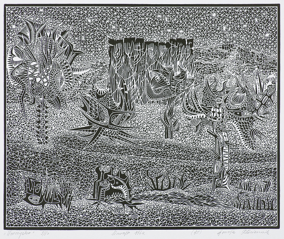 Henryk Płóciennik (Łódź 1933, Łódź 2020) malarz i grafik samouk. Zdobył wysoką pozycję jako grafik, pracujący głównie w technikach linorytu i autocynkografii. Jest autorem fantastycznych kompozycji o bogatym, ornamentalnym opracowaniu, obrazujących w zamyśle autora kosmiczne piękno i ład świata. Wielokrotnie wystawiał w kraju i za granicą, zdobywając liczne nagrody. Jego twórczość jest reprezentowana w czołowych zbiorach muzealnych, jak Muzeum Sztuki w Łodzi, liczne muzea narodowe i okręgowe, Biblioteka Jagiellońska i in. W 2004 w Łodzi powstała Fundacja „Arkadia” jego imienia, której celem jest zebranie, opracowanie i popularyzacja twórczości artysty. Artysta był również miłośnikiem i kolekcjonerem nagrań muzyki jazzowej.