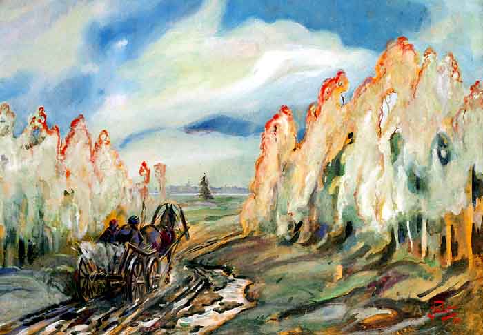 Julian Fałat (Tuligłowy [okręg lwowski] 1853 - Bystra k. Bielska 1929) - malarz i pedagog - jeden z najwybitniejszych artystów polskich okresu przełomu XIX i XX wieku, członek polskich i europejskich stowarzyszeń twórczych oraz Królewskiej Akademii Sztuk Pięknych w Berlinie, wielokrotnie odznaczany medalami na wystawach międzynarodowych. Studiował malarstwo u Władysława Łuszczkiewicza i Leona Dembowskiego w Szkole Sztuk Pięknych w Krakowie (1868-71 i 1881) i w Akademii Sztuk Pięknych w Monachium u Alexandra Strähubera i Johana Leonhardta Raaba (1877-80). Po studiach spędził kilka miesięcy w Rzymie, w 1884 był w Paryżu i w Hiszpanii, a w 1885 odbył podróż morską dookoła świata. W 1886 podczas polowania u ks. Radziwiłłów w Nieświeżu poznał późniejszego cesarza Niemiec Wilhelma II - dla którego następnie w latach 1886-95 pracował w Berlinie jako malarz nadworny. W latach 1894-96 współpracował z Wojciechem Kossakiem przy panoramie Berezyna. W 1895 został powołany na stanowisko dyrektora Szkoły Sztuk Pięknych w Krakowie, w której gruntownie zreformował system nauczania, przekształcając tę uczelnię w nowoczesną Akademię Sztuk Pięknych (r.1900). Do roku 1910 był rektorem Akademii; po przejściu na emeryturę osiadł w miejscowości Bystra k. Bielska. Znakomity akwarelista, malował także olejno. We wcześniejszym okresie tworzył w konwencji realistycznej, z czasem rozjaśnił i wzbogacił paletę, a w akwarelach wprowadzał rozlewną plamę barwną. Zasłynął jako malarz scen myśliwskich rozgrywających się najczęściej w zimowej scenerii; malował też pejzaże, wiejskie sceny rodzajowe, portrety, widoki miejskie.