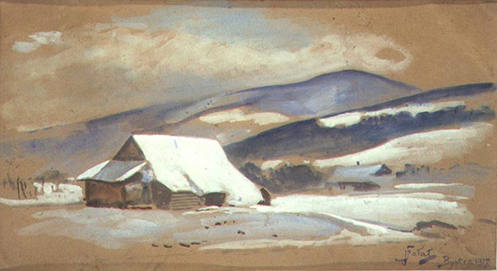 Julian Fałat (Tuligłowy [okręg lwowski] 1853 - Bystra k. Bielska 1929) - malarz i pedagog - jeden z najwybitniejszych artystów polskich okresu przełomu XIX i XX wieku, członek polskich i europejskich stowarzyszeń twórczych oraz Królewskiej Akademii Sztuk Pięknych w Berlinie, wielokrotnie odznaczany medalami na wystawach międzynarodowych. Studiował malarstwo u Władysława Łuszczkiewicza i Leona Dembowskiego w Szkole Sztuk Pięknych w Krakowie (1868-71 i 1881) i w Akademii Sztuk Pięknych w Monachium u Alexandra Strähubera i Johana Leonhardta Raaba (1877-80). Po studiach spędził kilka miesięcy w Rzymie, w 1884 był w Paryżu i w Hiszpanii, a w 1885 odbył podróż morską dookoła świata. W 1886 podczas polowania u ks. Radziwiłłów w Nieświeżu poznał późniejszego cesarza Niemiec Wilhelma II - dla którego następnie w latach 1886-95 pracował w Berlinie jako malarz nadworny. W latach 1894-96 współpracował z Wojciechem Kossakiem przy panoramie Berezyna. W 1895 został powołany na stanowisko dyrektora Szkoły Sztuk Pięknych w Krakowie, w której gruntownie zreformował system nauczania, przekształcając tę uczelnię w nowoczesną Akademię Sztuk Pięknych (r.1900). Do roku 1910 był rektorem Akademii; po przejściu na emeryturę osiadł w miejscowości Bystra k. Bielska. Znakomity akwarelista, malował także olejno. We wcześniejszym okresie tworzył w konwencji realistycznej, z czasem rozjaśnił i wzbogacił paletę, a w akwarelach wprowadzał rozlewną plamę barwną. Zasłynął jako malarz scen myśliwskich rozgrywających się najczęściej w zimowej scenerii; malował też pejzaże, wiejskie sceny rodzajowe, portrety, widoki miejskie.