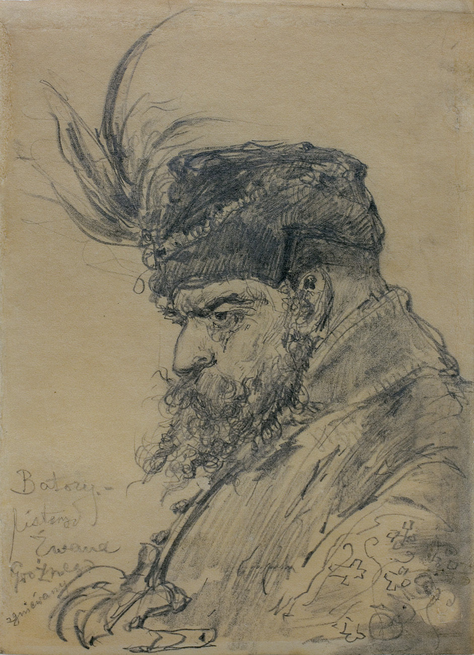 Jan Matejko (Kraków 1838 - Kraków 1893) - najwybitniejszy polski malarz historyczny; studia malarskie rozpoczął pod kierunkiem W. Łuszczkiewicza i W. K. Stattlera w krakowskiej Szkole Sztuk Pięknych (lata 1852-1858). Następnie uczył się w Akademii monachijskiej u H. Anschütza (1859) i przez dwa miesiące w Akademii wiedeńskiej u C. Rubena (1860). Po studiach mieszkał i pracował w Krakowie. W 1873 objął stanowisko dyrektora tamtejszej Szkoły Sztuk Pięknych, pełniąc tę funkcję aż do śmierci. Dużo podróżował - wielokrotnie wyjeżdżał do Paryża (w latach 1865-1880), Wiednia (1866-1888), w 1872 był w Konstantynopolu, a rok później w Pradze i Budapeszcie, odwiedzał również Włochy (1878-1879 i 1883). Był członkiem licznych akademii i towarzystw artystycznych m.in. Académie des Beaux-Arts (1873) i Instytutu Francuskiego (1874) w Paryżu, berlińskiej Akademii Sztuki (1874), Akademii Rafaelowskiej w Urbino (1878) i Künstlersgenossenschaft w Wiedniu (1888). W 1864 został członkiem Towarzystwa Naukowego w Krakowie, w 1887 otrzymał doktorat filozofii honoris causa Uniwersytetu Jagiellońskiego. Był twórcą wielkich i znanych płócien, m.in. Kazania Skargi, Rejtana, Unii Lubelskiej, Batorego pod Pskowem, Bitwy pod Grunwaldem, Hołdu Pruskiego czy Kościuszki pod Racławicami. Malował także portrety i - rzadziej - sceny religijne czy rodzajowe. Ważną rolę w jego twórczości odgrywał rysunek - artysta opracował, m.in. album Ubiory w Polsce od 1200 do 1795 oraz rysunkowy cykl Poczet królów i książąt polskich. W latach 1889-1891, wraz z zespołem uczniów, pracował nad polichromią kościoła Mariackiego w Krakowie. W rodzinnym domu malarza, przy ulicy Floriańskiej w Krakowie od 1898 mieści się poświęcone mu muzeum - Dom Matejki (Oddział MNK).