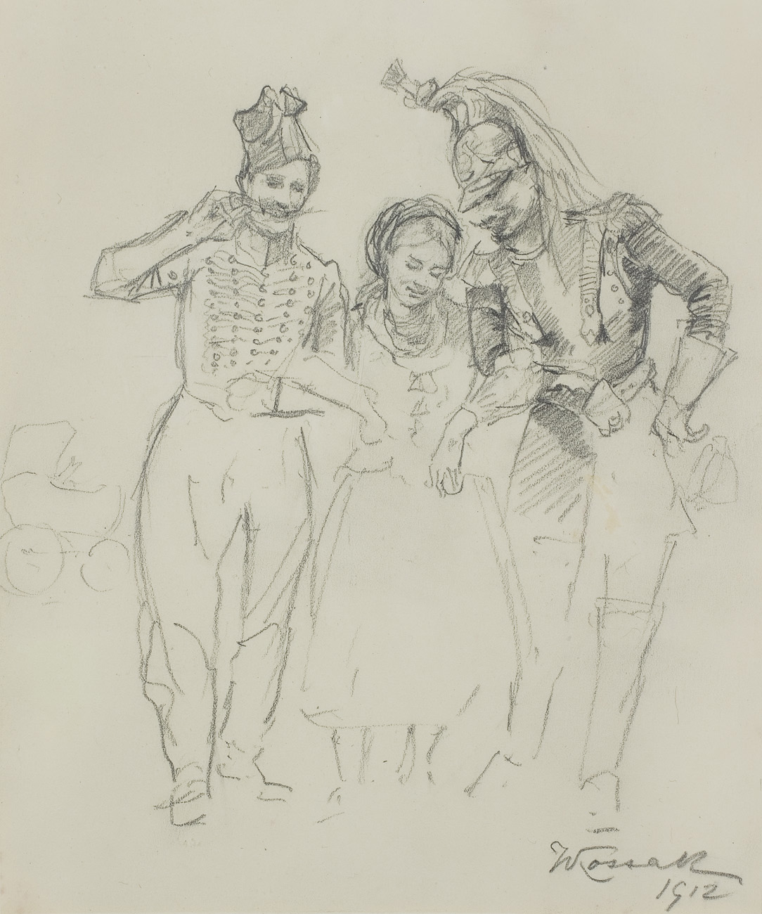 Rysunek Dziewczyna i żołnierze powstał jako wstępny projekt, pomysł ilustracji do Wspomnień Wojciecha Kossaka. Ta bogato ilustrowana książka wydana nakładem Gebethnera i Wolffa, ukazała się w Krakowie w roku 1912 (wyd. II; 1913), a w rok później także w Berlinie. Zawierała liczne ilustracje czarno-białe i kilka kolorowych. Wśród nich były fotografie, 14 reprodukcji obrazów wcześniejszych i 54 ilustracje specjalni...