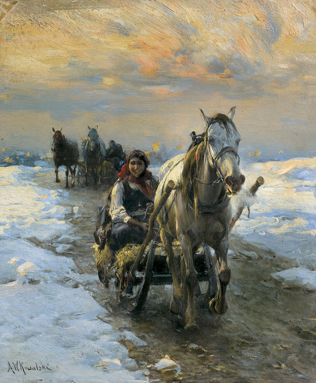 Alfred Wierusz-Kowalski (Suwałki 1849 – Monachium 1915) - jeden z najwybitniejszych polskich malarzy tzw. szkoły monachijskiej był, obok Józefa Brandta i Władysława Czachórskiego, także najpopularniejszym z polskich artystów osiadłych i stale działających w Monachium. Zamieszkał tam w roku 1873, już po studiach w Warszawie i w Dreźnie. Przez rok uczył się jeszcze w monachijskiej Akademii Sztuk Pięknych pod kierunkiem Alexandra Wagnera, a następnie przeniósł się do prywatnej pracowni Brandta. Uznanie krytyki i publiczności zdobył wcześnie; jego obrazy, odznaczane medalami na wystawach były rozchwytywane przez kolekcjonerów i niemieckich handlarzy. W roku 1890 został honorowym profesorem Akademii monachijskiej. Malował sceny rodzajowe i rodzajowo-historyczne z motywami jeźdźców, rycerzy, myśliwych, koni, wilków i śniegów. Po podróży do Afryki w roku 1903 podejmował też tematy orientalne. W polskich zbiorach muzealnych znalazło się stosunkowo niewiele prac artysty – jego obrazy sprzedawane głównie na rynku niemieckim w większej liczbie trafiały do kolekcji prywatnych, głównie w Niemczech i Stanach Zjednoczonych. Obecne często pojawiają się i na polskim rynku sztuki, zawsze budząc zainteresowanie kolekcjonerów.