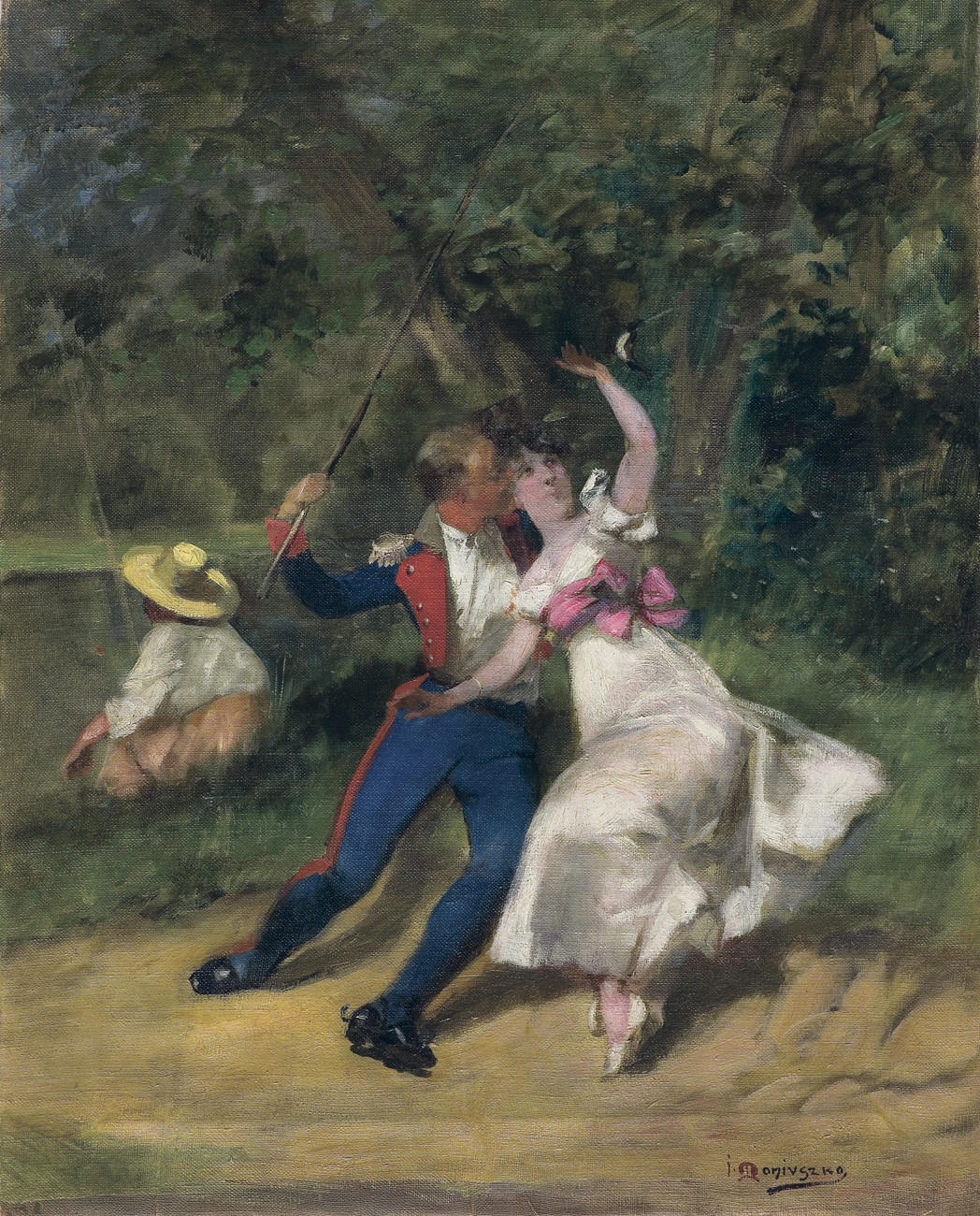 Jan Czesław Moniuszko (Wilno 1853 - Warszawa 1908) - syn kompozytora Stanisława - od roku 1871 uczył się malarstwa w warszawskiej Klasie Rysunkowej u Wojciecha Gersona i Antoniego Kamińskiego, a także prywatnie u Gersona i B.Dziadulewicza. W roku 1878 studiował w Akademii Sztuk Pięknych w Petersburgu. Od 1880 stale mieszkał i pracował w Warszawie. Malował sceny rodzajowe, historyczne, historyczno-rodzajowe i religijne. Jego dzieła wyróżniają się dobrą kompozycją, barwnością, wyczuciem nastroju i stylu epok historycznych, przy czym najbliższe były mu czasy stanisławowskie. Debiutował w roku 1879 na wystawie w warszawskiej Zachęcie, zwracając uwagę krytyki obrazem Pierwsze spotkanie Jadwigi z Jagiełłą. Później jeszcze wielokrotnie wystawiał w Zachęcie, w Salonie Krywulta, Salonie Ungra i Salonie Artystycz-nym gdzie w roku 1905 odbyła się zbiorowa wystawa jego prac (ok. 50 obrazów). Wystawiał także w Krakowie, w Łodzi i w Kijowie.