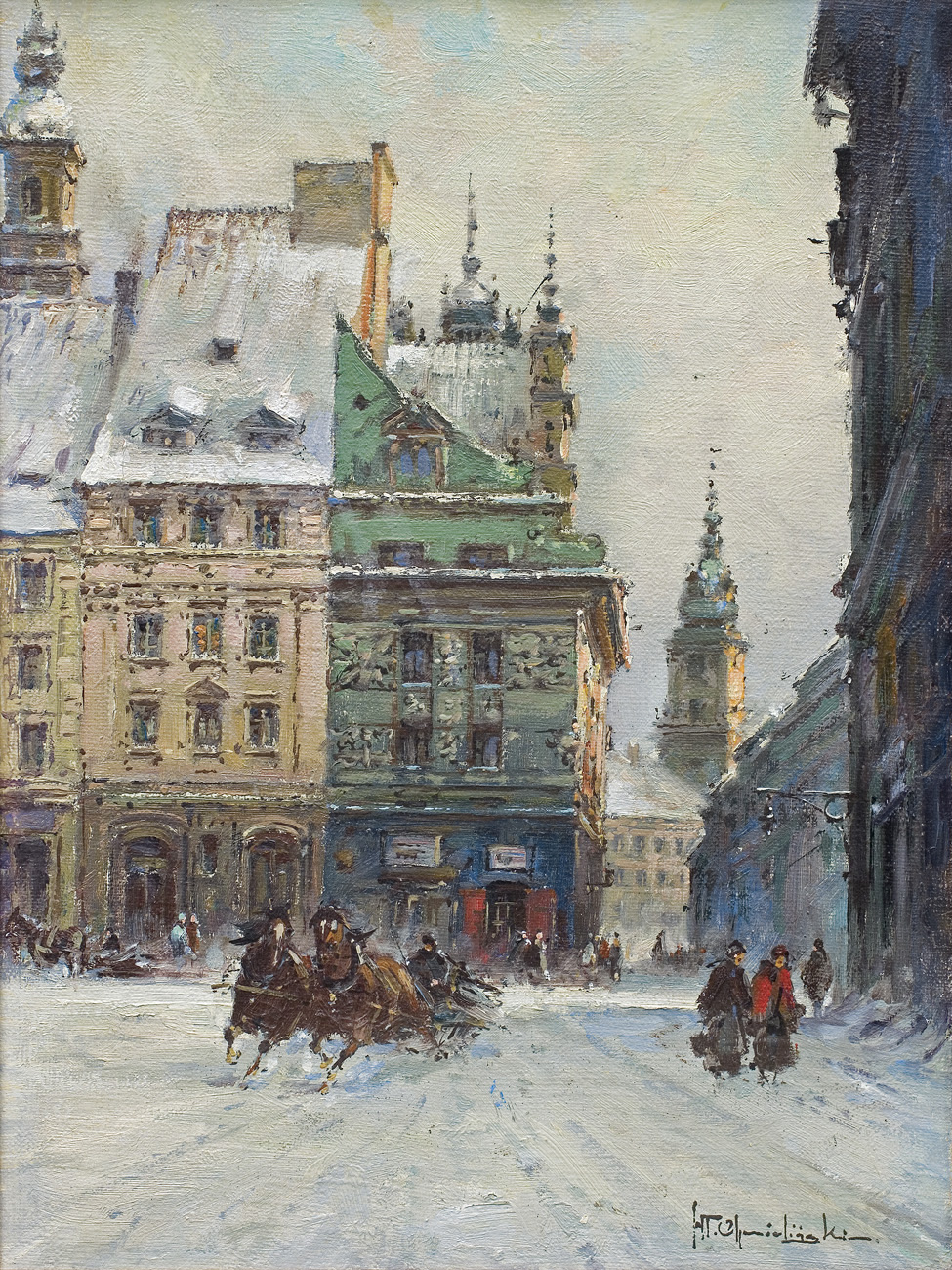 Władysław Chmieliński (Warszawa 1911 - Warszawa 1979) był malarzem związanym z Warszawą, gdzie stale mieszkał i pracował. W latach 1926-1931 studiował w warszawskiej Miejskiej Szkole Sztuk Zdobniczych i Malarstwa (dawna Klasa Rysunkowa). Wiodącym tematem jego obrazów były widoki miejskie, malowane olejno i akwarelą. W latach 1935-1938 stworzył cykl akwarel przedstawiających obiekty polskiej architektury; wśród nich, widoki Sandomierza, Krakowa, Kazimierza nad Wisłą, a także wnętrza zabytkowych kościołów czy pałaców, m.in. Zamku Królewskiego w Warszawie i Pałacu w Wilanowie. Malował także pejzaże i wiejskie sceny rodzajowe – kuligi, sanny, zaprzęgi, wesela, konie na tle krajobrazu. W latach 1967-1969 wyjeżdżał na dłuższe pobyty do Danii. W latach 1936-1939 artysta używał także pseudonimu „Władysław Stachowicz”.