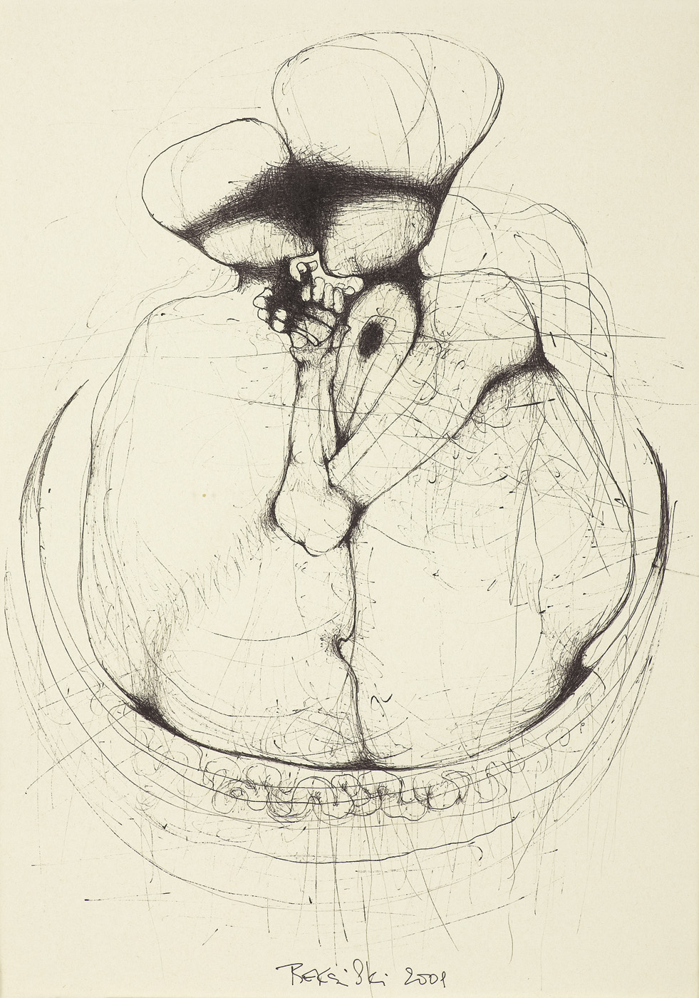 Zdzisław Beksiński (Sanok 24 II 1929 - Warszawa 21 II 2005) studiował w latach 1947-1952 na Wydziale Architektury Politechniki Krakowskiej. Był artystą samoukiem, który osiągnął niekwestionowaną pozycję w polskiej sztuce współczesnej, potwierdzoną obecnością jego prac na prestiżowych wystawach i w kolekcjach muzealnych. Początkowo zajmował się fotografią, którą interesował się od lat studenckich, po 1956 zyskując uznanie jako twórca fotogramów o estetyce opartej o efekty fakturowe. W latach 1958-1962 tworzył abstrakcyjne obrazy-reliefy o bogatej fakturze, głównie metalowe, będące odmianą malarstwa materii. Pod koniec tego okresu powstawały ażurowe formy o kształtach figur i pełnoplastyczne rzeźby w metalu. Kolejnym etapem jego twórczości były lata 1962-1974, kiedy poświęcał się głównie rysunkowi. W latach 60. rysował piórkiem i tuszem figuralne kompozycje odznaczające się karykaturalną deformacją postaci. Od końca lat 60. tworzył rysunki węglem i kredkami, będące monochromatyczną odmianą jego równoległej twórczości malarskiej. Od 1974 zajmował się niemal niepodzielnie malarstwem. Jego charakterystyczny styl bazował na perfekcji technicznej, której towarzyszyła niezwykłość wizji. Malował świat po katastrofie, naznaczony piętnem śmierci i rozpadu. Jego obrazy zaludniają postaci i stwory o ludzkich wprawdzie bądź zwierzęcych kształtach, lecz o cechach fantomów, automatów lub rozpadających się trucheł. Artysta nie nadawał swym obrazom i rysunkom tytułów (poza porządkującymi symbolami), akcentując w ten sposób swój brak zainteresowania dla literackiej strony przedstawień. Sam mówił, że malując całkowicie poddaje się wizji, „fotografuje“ ją. W ostatnich latach włączył do swego warsztatu artystycznego elektroniczne techniki generowania obrazu, które wykorzystywał do tworzenia komputerowych fotomontaży. Sztuka Beksińskiego, wielokrotnie wystawiana i omawiana, budzi skrajne emocje wśród znawców i publiczności.