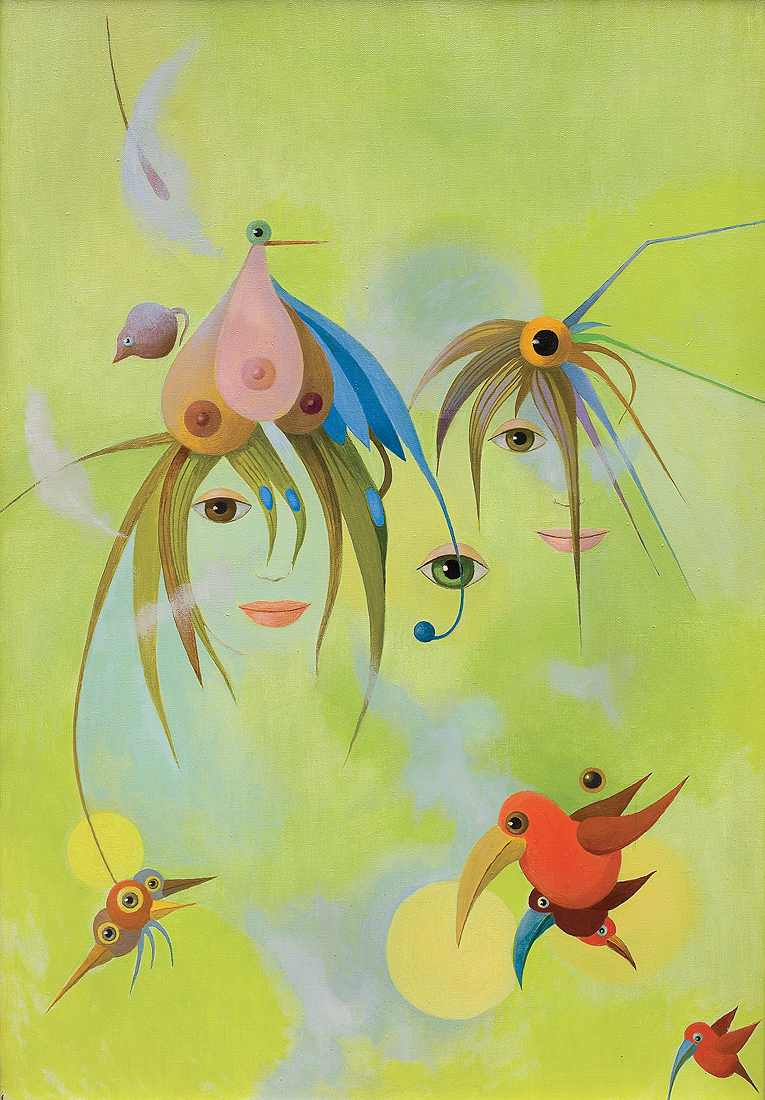 Kazimierz Mikulski (Kraków 1918 - Kraków 1998) rozpoczął studia malarskie przed II wojną światową w ASP w Krakowie, kontynuował je w latach 1939-1940 pod kierunkiem prof. Fryderyka Pautscha w Kunstgewerbeschule, powstałej za okupacji w miejsce Akademii. Po wojnie ukończył dwuletnie studia aktorskie w Studio Dramatycznym przy Starym Teatrze w Krakowie i do 1948 pracował jako aktor. Jednocześnie w 1945 ukończył Warsztat Filmowy Młodych. W latach 1948-1979 był kierownikiem plastycznym i scenografem Teatru Groteska w Krakowie, dla którego projektował lalki, kostiumy, dekoracje itp. Równolegle cały czas zajmował się malarstwem i działalnością w kręgu Tadeusza Kantora, zrazu jako członek Gru-py Młodych Plastyków, a od 1957 w Grupie Krakowskiej, której był współzałożycielem i prezesem w latach 1965-1967. Był też członkiem zespołu teatru Cricot 2, grał m.in. w spektaklach Kurka wodna, Nadobnisie i koczkodany, Umarła klasa oraz we własnej sztuce Cyrk. W swych obrazach z drugiej poł. lat 40. artysta przedstawiał lekkie, linearne formy unoszące się w pustych przestrzeniach. Było to malarstwo zarazem surrealistyczne i abstrakcyjne. Lecz już ok. 1950 zaczął malować w charaktery-styczny dlań sposób - odrzucając abstrakcję, prezentował niezliczone warianty i układy kilku ulubionych motywów (głowa lub postać kobiety-lalki, koty, motyle).