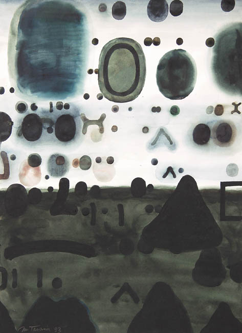 Jan Tarasin (Kalisz 11 IX 1926 - Warszawa 8 VIII 2009) studiował malarstwo w ASP w Krakowie pod kierunkiem prof. Zbigniewa Pronaszki (1946-1951). Jeszcze jako student zadebiutował na I Wystawie Sztuki Nowoczesnej w Krakowie w 1948/49. W połowie lat 50. stworzył cykle litografii: „Nowa Huta i jej mieszkańcy“, 1954, „Dom“, 1955). W pierwszym przeciwstawił się oficjalnemu optymizmowi, w drugim, operując symboliką martwej natury, zawarł treści egzystencjalne i odnoszące do niedawnego dramatu wojny. Po 1956 zaczął malować obrazy niefiguratywne. Układy wyodrębnionych elementów (określanych jako „przedmioty“) umieszczane były przez artystę na płaszczyźnie (cykl „Wnętrze“, 1957) ), lub w aluzyjnej przestrzeni (cykle „Uczta“, 1957, „Brzeg“, 1962-1964, „Przedmioty policzone“, od 1968, „Antykwariat“, 1968). Zasada ta utrzymuje się w jego malarstwie w następnych latach, różnice między okresami twórczości dotyczą sposobu opracowania „przedmiotów“ i ich usytuowania w przestrzeni obrazu lub wobec tła. Od lat 70. „przedmioty“ zmieniają się w graficzne, zwykle czarne znaki na jasnych tłach (cykl „Kolekcja“, od 1971). Tła z kolei bywają iluzyjnie przestrzenne, zróżnicowane walorowo, miękkie. W latach 90. artysta wrócił do kolorystycznego, bardziej malarskiego rozwiązywania zarówno znaków, jak i teł, często ciemnych lub przenikających się z „przedmiotami“ (cykl „Wylęgarnia przedmiotów“, 1992). Tarasin od 1962 jest członkiem „Grupy Krakowskiej“. W 1963-67 uczył na Wydziale Architektury Wnętrz krakowskiej ASP. W 1967 przeniósł się do Warszawy, w 1974 podjął pracę pedagogiczną na Wydziale Malarstwa ASP w Warszawie. W 1987-90 był rektorem tej uczelni. W 1976 otrzymał Nagrodę Krytyki Artystycznej im. Cypriana Kamila Norwida, w 1984 Nagrodę im. Jana Cybisa.; Nagroda na MB Sztuki w San Marino 1965. Równolegle z malarstwem zajmował się rysunkiem i grafiką - do lat 60. litografią, od 1974 serigrafią. W 1974-1981 wydał 8 autorskich „Zeszytów“ z serigrafiami i własnymi tekstami. W 1995 w Galerii Zachęta odbyła się wystawa artysty, której towarzyszył monograficzny katalog.