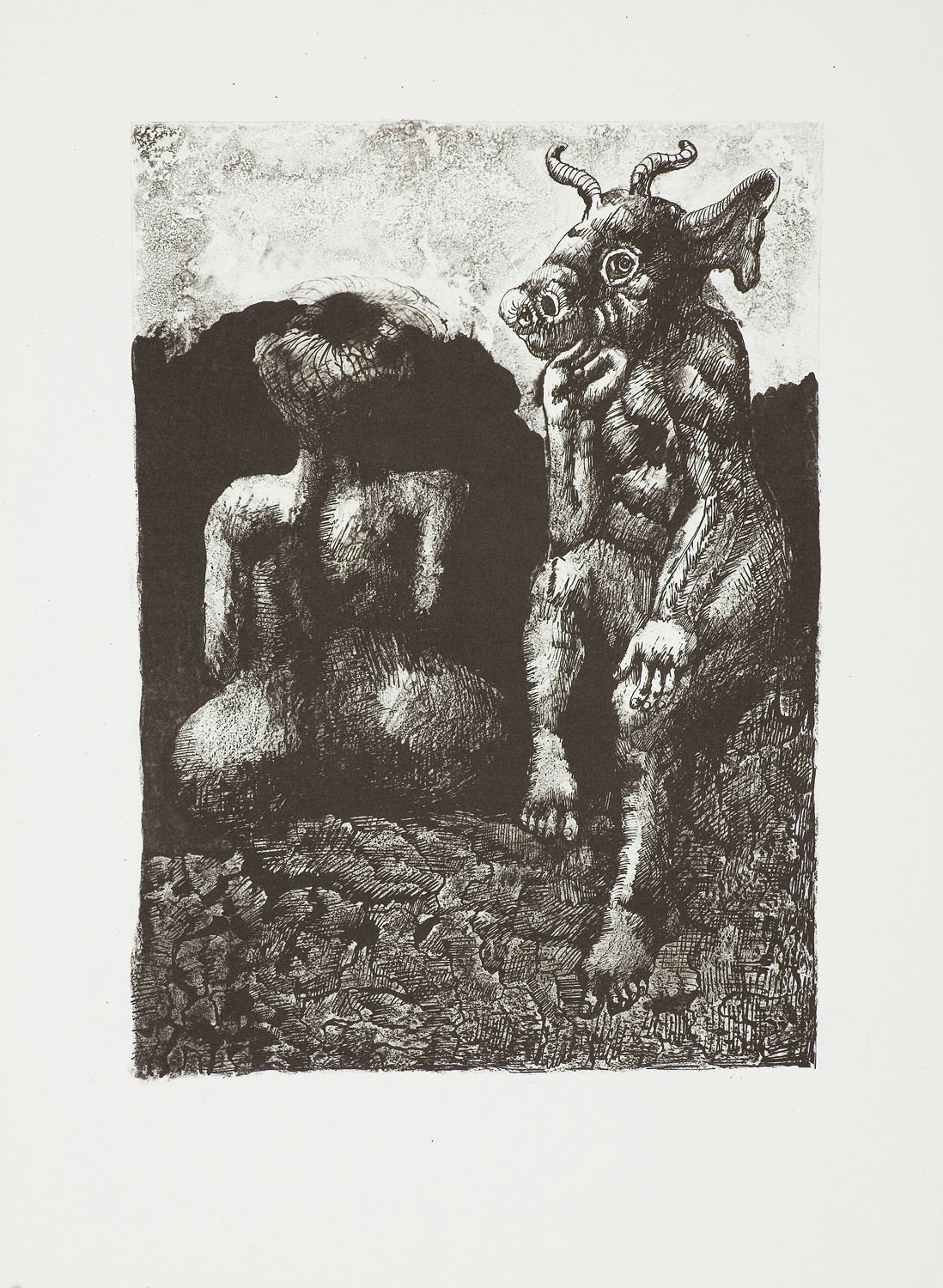 Jan Lebenstein (Brześć Litewski 1930 - Kraków 1999) w latach 1948-1954 studiował malarstwo w ASP w Warszawie pod kierunkiem prof. Eugeniusza Eibischa i Artura Nachta-Samborskiego. W 1955 wziął udział w wystawie w warszawskim Arsenale. Zaprzyjaźniony w czasie studiów z Mironem Białoszewskim, swą pierwszą wystawę indywidualną pokazał w 1956 w Teatrze na Tarczyńskiej. W 1959 zdobył Grand Prix de la Ville de Paris na I Biennale Młodych w Paryżu i w tym roku przeniósł się na stałe do Paryża. Po seriach "figur kreślonych" (na papierze milimetrowym) i "figur hieratycznych" z lat 1955-1958 maluje cykl "figur osiowych" (1958-1962), które wystawia w Paryżu i USA. Równolegle w 1960 zaczyna rysowane "karnety", rodzaj dziennika, który w przyszłości dostarczy motywów wykorzystanych w obrazach. W latach 1964-1965 maluje "Bestiarium", cykl fakturowych, archaizowanych stworów przypominających prehistoryczne wykopaliska. Bezpośrednio po nich wprowadza do swych obrazów postaci ludzkie i fantastyczne, odgrywające sceny ni to mitologiczne, ni to ze snu, często przesycone erotyką. W 1970 projektuje witraże dla Centre du Dialogue w Paryżu. W W 1971 otrzymuje obywatelstwo francuskie 1974 powstają gwasze inspirowane Folwarkiem zwierzęcym George'a Orwella. W latach 1976-1989 tworzy wyłącznie w technice gwaszu i pastelu, podejmując tematykę mitologiczną i zaczerpniętą z Biblii: cykle ilustracji do Księgi Hioba (wyd. 1979) i do Apokalipsy (wyd. 1986) w nowych przekładach Czesława Miłosza. W 1989 powraca do malarstwa olejnego (cykl "Pergamon"). Artysta otrzymał m. in. nagrodę Fundacji im. Alfreda Jurzykowskiego w 1976, Nagrodę Muzeum Archidiecezji Warszawskiej w 1985, Nagrodę im. Jana Cybisa w 1987.