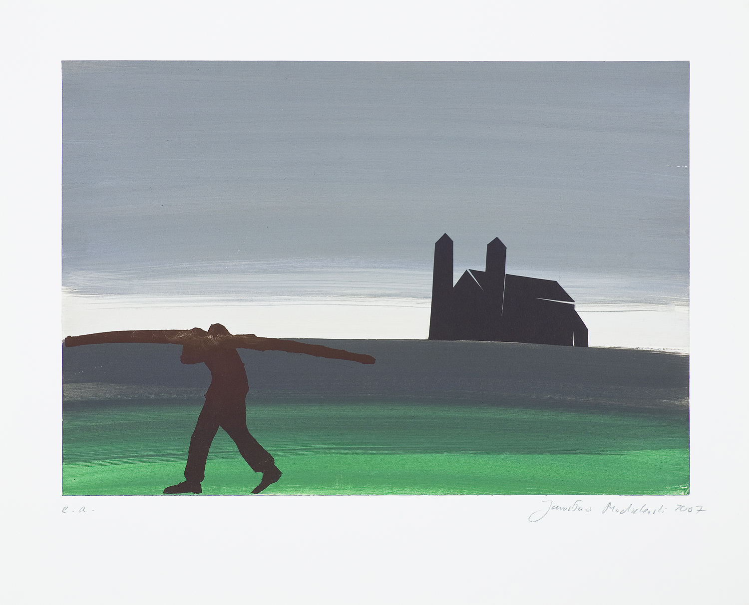 Jarosław Modzelewski (Warszawa 1955, mieszka w Warszawie) studiował malarstwo w ASP w Warszawie w latach 1975-1980, uzyskując dyplom w pracowni Stefana Gierowskiego. Od 1982 pracuje jako pedagog na macierzystym wydziale. W 1982 był współzałożycielem „Gruppy”, najważniejszego ugrupowania nurtu nowej ekspresji lat 80., działającego do 1992. W latach 1991-1996 wspólnie z Markiem Sobczykiem prowadził prywatną Szkołę Sztuki w Warszawie. Od wielu lat współpracuje z Galerią Zderzak w Krakowie. W początkowym okresie twórczości skłaniał się ku abstrakcji, wykorzystywał uproszczone znaki i emblematy oraz sylwetki odbite z szablonu. W 1985 namalował cykl oparty na ilustracjach do podręczników języka rosyjskiego, obrazujący proste czynności, których czasownikowe określenia stanowią tytuły prac. W 1986-1989 powstawały obrazy utrzymane w konwencji realistycznej, jednak zarazem o surrealnej atmosferze uzyskiwanej różnymi metodami, np. przez dublowanie figur, ukazywanie postaci w sytuacji niepewności czy zagrożenia, zabiegi z przestrzenią. W grupie obrazów z 1988 artysta rezygnuje z postaci ludzkiej na rzecz wyjątkowego nasycenia emocją samej przestrzeni pejzaży i wnętrz. Około 1990 wraca do kompozycji akcentujących czynności wykonywane przez postaci, które często umieszczone są w pustej, zaledwie zasugerowanej, acz dominującej przestrzeni. Odrealnienia i monumentalności dodaje tym obrazom płaskie i rozległe kładzenie koloru.