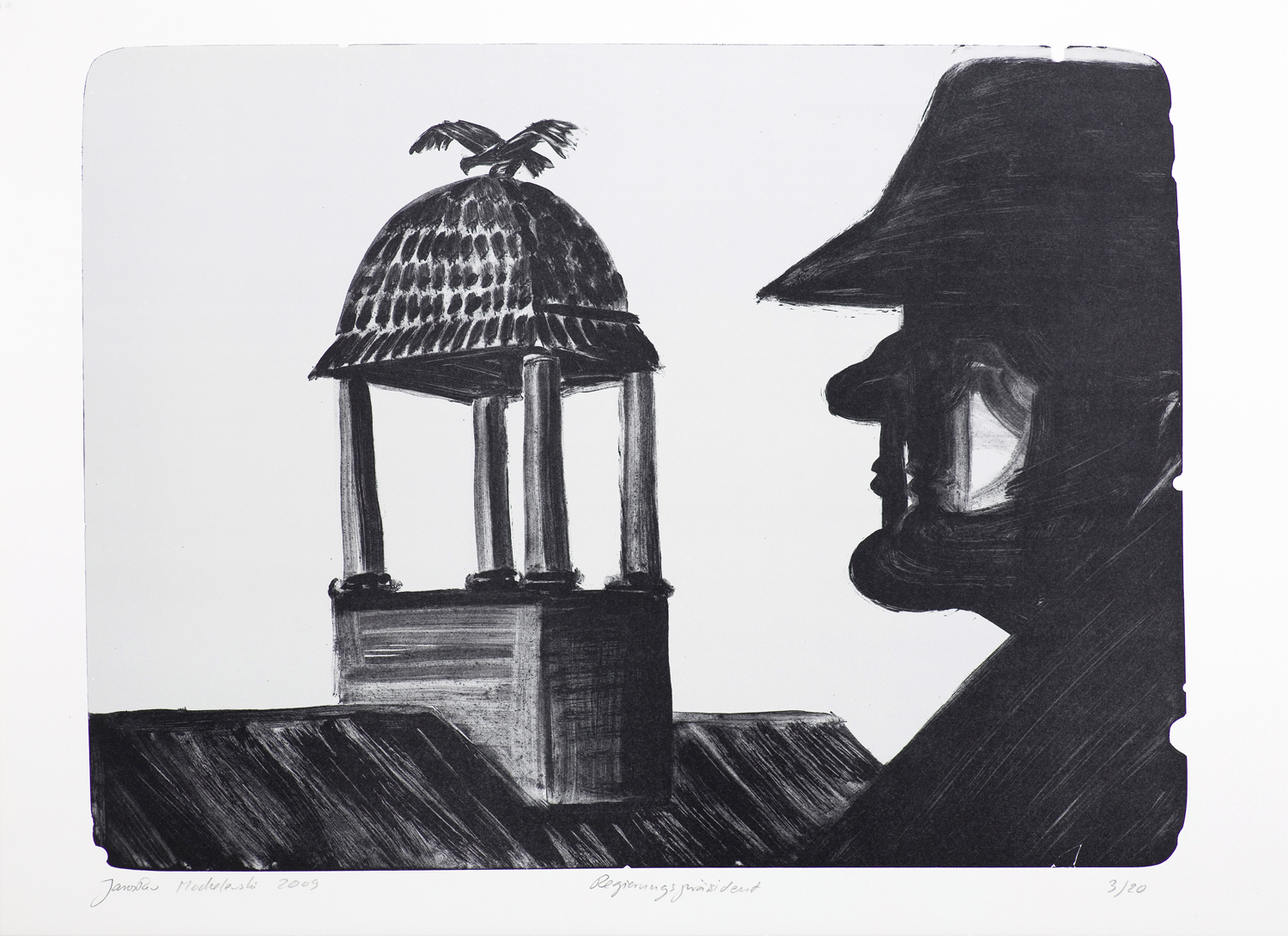Jarosław Modzelewski (Warszawa 1955, mieszka w Warszawie) studiował malarstwo w ASP w Warszawie w latach 1975-1980, uzyskując dyplom w pracowni Stefana Gierowskiego. Od 1982 pracuje jako pedagog na macierzystym wydziale. W 1982 był współzałożycielem „Gruppy”, najważniejszego ugrupowania nurtu nowej ekspresji lat 80., działającego do 1992. W latach 1991-1996 wspólnie z Markiem Sobczykiem prowadził prywatną Szkołę Sztuki w Warszawie. Od wielu lat współpracuje z Galerią Zderzak w Krakowie. W początkowym okresie twórczości skłaniał się ku abstrakcji, wykorzystywał uproszczone znaki i emblematy oraz sylwetki odbite z szablonu. W 1985 namalował cykl oparty na ilustracjach do podręczników języka rosyjskiego, obrazujący proste czynności, których czasownikowe określenia stanowią tytuły prac. W 1986-1989 powstawały obrazy utrzymane w konwencji realistycznej, jednak zarazem o surrealnej atmosferze uzyskiwanej różnymi metodami, np. przez dublowanie figur, ukazywanie postaci w sytuacji niepewności czy zagrożenia, zabiegi z przestrzenią. W grupie obrazów z 1988 artysta rezygnuje z postaci ludzkiej na rzecz wyjątkowego nasycenia emocją samej przestrzeni pejzaży i wnętrz. Około 1990 wraca do kompozycji akcentujących czynności wykonywane przez postaci, które często umieszczone są w pustej, zaledwie zasugerowanej, acz dominującej przestrzeni. Odrealnienia i monumentalności dodaje tym obrazom płaskie i rozległe kładzenie koloru.