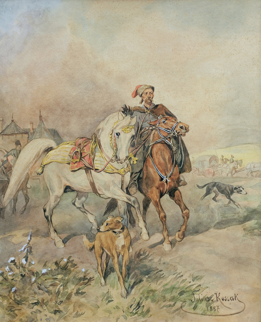 Juliusz Kossak (Wiśnicz 1824 - Kraków 1899) - malarz i ilustrator - był jednym z najpopularniejszych artystów polskich 2. połowy XIX wieku. Naukę rysunku i malarstwa rozpoczął we lwowskiej pracowni Jana Maszkowskiego; później wiele rysował z natury odwiedzając majątki szlacheckie na Ukrainie, Podolu i Wołyniu. W roku 1852 był w Wiedniu, na Węgrzech i w Petersburgu, a następnie zamieszkał na stałe w Warszawie. Lata 1856-1860 spędził w Paryżu, gdzie przyjaźnił się z Horacem Vernetem. Powróciwszy do Warszawy w latach 1862-1868 był kierownikiem artystycznym „Tygodnika Ilustrowanego”. W roku 1869 przeniósł się na stałe do Krakowa, skąd wyjeżdżał jeszcze do Monachium, by malować w atelier batalisty Franza Adama. Kossak był przede wszystkim znakomitym akwarelistą; rzadziej posługiwał się techniką olejną. Malował obrazy historyczne i batalistyczne, sceny rodzajowe ilustrujące życie i tradycje dworu szlacheckiego oraz obyczaje polskiego ludu. Ale prawdziwymi bohaterami jego obrazów były konie, których ruch, temperament, charakter i indywidualność potrafił po mistrzowsku przedstawić. Był także autorem wielu ilustracji do czasopism i książek, trafiającym bezbłędnie tak w klimat utworów literackich, jak i w tęsknoty i potrzeby odbiorców - czytelników Pieśni o ziemi naszej Wincentego Pola, Trylogii Henryka Sienkiewicza, Pana Tadeusza i poematów Adama Mickiewicza.