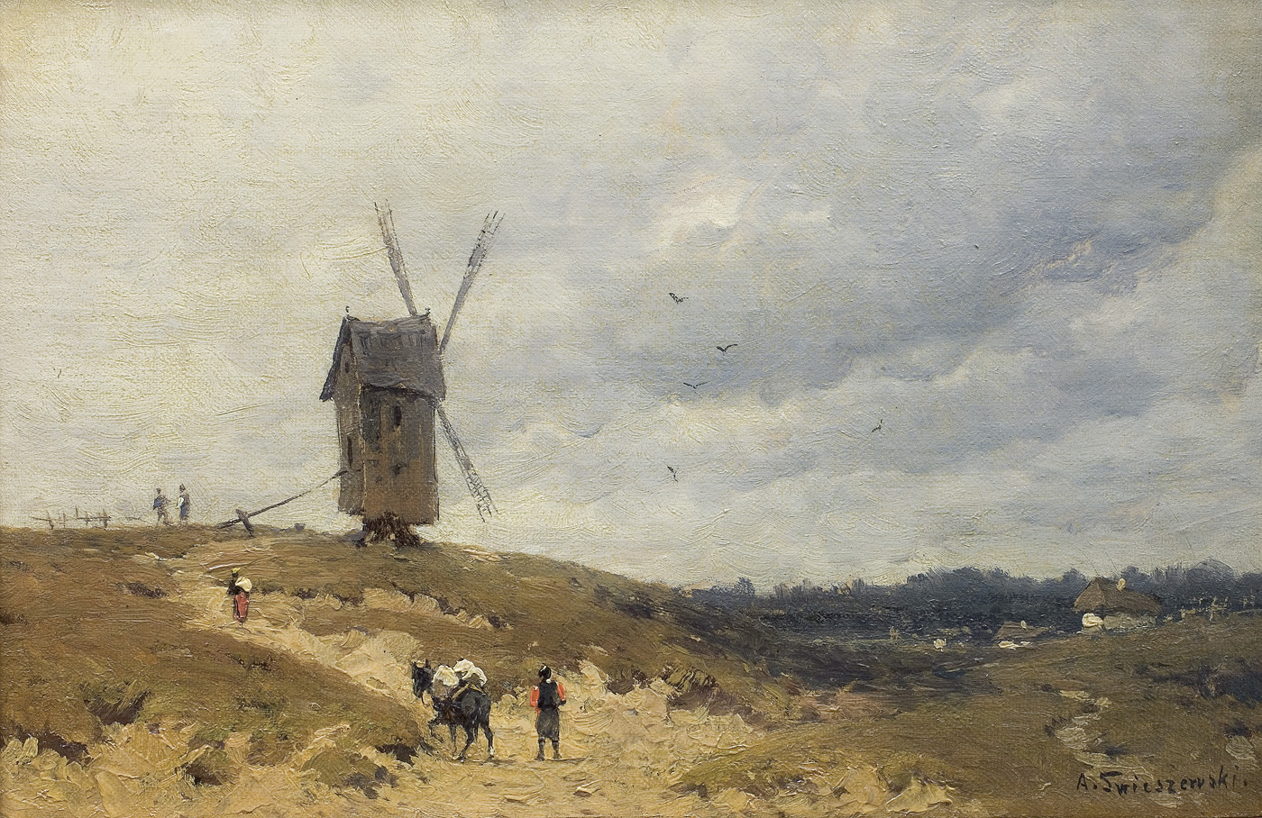 Aleksander Świeszewski był malarzem pejzażystą, jednym z przedstawicieli polskiej kolonii artystycznej w Monachium. Naukę malarstwa rozpoczął w warszawskiej Szkole Sztuk Pięknych, jako uczeń Christiana Breslauera. W roku 1863 walczył w powstaniu styczniowym; po jego upadku wyjechał do Monachium i kształcił się w tamtejszej Akademii u prof. Fritza Bambergera. Wiele podróżował – był we Włoszech i Francji, wyjeżdżał do Tyrolu i Szwajcarii. W 1873 zamieszkał na stałe w Monachium. Często jednak przejeżdżał do kraju; chętnie odwiedzał Tatry. W czasie podróży wykonywał studia i malarskie szkice z natury, które służyły mu później przy malowaniu obrazów, wykańczanych już w pracowni. Najchętniej malował krajobrazy górskie, często oświetlone promieniami zachodzącego słońca. Przedstawiał też pejzaże nadmorskie i ogrody ze starożytnymi ruinami. Artysta wystawiał w wielu miastach europejskich, a także w kraju; w Zachęcie w Warszawie i Towarzystwie Przyjaciół Sztuk Pięknych w Krakowie (w latach 1864-1895 niemal corocznie). Jego obrazy cieszyły się niekłamanym uznaniem krytyki oraz powodzeniem u publiczności. W 1881 jeden z pejzaży kupił sam Ludwik II, król Bawarii. Po śmierci artysty, w monachijskim Kunstvereinie – w kwietniu 1896 – urządzono wystawę jego spuścizny twórczej. Wówczas to – jak pisał monachijski krytyk – „można było stwierdzić jak bardzo był on oddany sztuce. Każde studium pokazuje, jak potrafił z wielką techniczną umiejętnością oddać szlachetnie rozumianą, głęboko odczutą naturę [..] wszystkie przenikał poetyczny urok”. (cyt. za: H.Stępień, M.Liczbińska, Artyści polscy w środowisku monachijskim w latach 1828-1914. Materiały źródłowe, Warszawa 1994, s. 97).