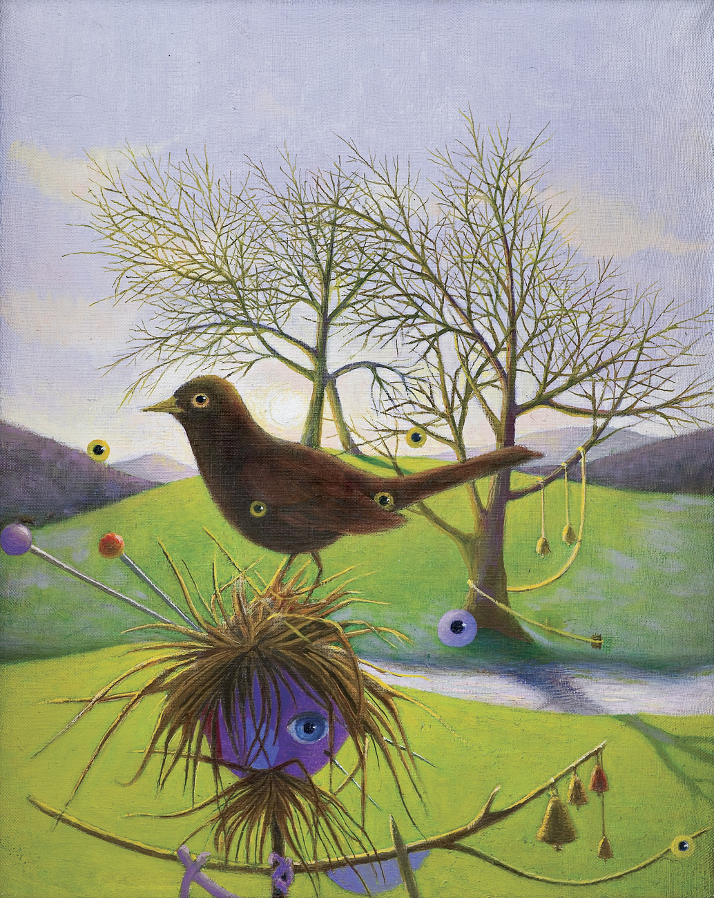 Kazimierz Mikulski (Kraków 1918 - Kraków 1998) rozpoczął studia malarskie przed II wojną światową w ASP w Krakowie, kontynuował je w latach 1939-1940 pod kierunkiem prof. Fryderyka Pautscha w Kunstgewerbeschule, powstałej za okupacji w miejsce Akademii. Po wojnie ukończył dwuletnie studia aktorskie w Studio Dramatycznym przy Starym Teatrze w Krakowie i do 1948 pracował jako aktor. Jednocześnie w 1945 ukończył Warsztat Filmowy Młodych. W latach 1948-1979 był kierownikiem plastycznym i scenografem Teatru Groteska w Krakowie, dla którego projektował lalki, kostiumy, dekoracje itp. Równolegle cały czas zajmował się malarstwem i działalnością w kręgu Tadeusza Kantora, zrazu jako członek Gru-py Młodych Plastyków, a od 1957 w Grupie Krakowskiej, której był współzałożycielem i prezesem w latach 1965-1967. Był też członkiem zespołu teatru Cricot 2, grał m.in. w spektaklach Kurka wodna, Nadobnisie i koczkodany, Umarła klasa oraz we własnej sztuce Cyrk. W swych obrazach z drugiej poł. lat 40. artysta przedstawiał lekkie, linearne formy unoszące się w pustych przestrzeniach. Było to malarstwo zarazem surrealistyczne i abstrakcyjne. Lecz już ok. 1950 zaczął malować w charaktery-styczny dlań sposób - odrzucając abstrakcję, prezentował niezliczone warianty i układy kilku ulubionych motywów (głowa lub postać kobiety-lalki, koty, motyle).