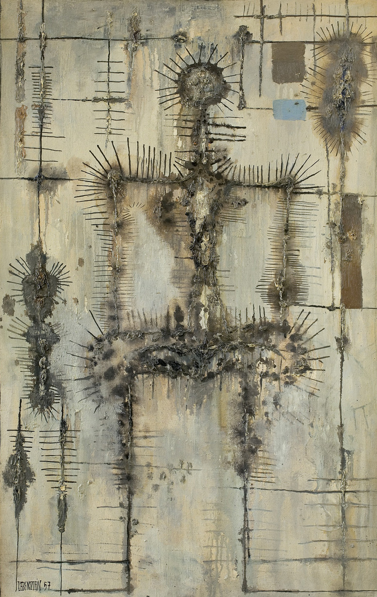 Jan Lebenstein (Brześć Litewski 1930 - Kraków 1999) w latach 1948-1954 studiował malarstwo w ASP w Warszawie pod kierunkiem prof. Eugeniusza Eibischa i Artura Nachta-Samborskiego. W 1955 wziął udział w wystawie w warszawskim Arsenale. Zaprzyjaźniony w czasie studiów z Mironem Białoszewskim, swą pierwszą wystawę indywidualną pokazał w 1956 w Teatrze na Tarczyńskiej. W 1959 zdobył Grand Prix de la Ville de Paris na I Biennale Młodych w Paryżu i w tym roku przeniósł się na stałe do Paryża. Po seriach "figur kreślonych" (na papierze milimetrowym) i "figur hieratycznych" z lat 1955-1958 maluje cykl "figur osiowych" (1958-1962), które wystawia w Paryżu i USA. Równolegle w 1960 zaczyna rysowane "karnety", rodzaj dziennika, który w przyszłości dostarczy motywów wykorzystanych w obrazach. W latach 1964-1965 maluje "Bestiarium", cykl fakturowych, archaizowanych stworów przypominających prehistoryczne wykopaliska. Bezpośrednio po nich wprowadza do swych obrazów postaci ludzkie i fantastyczne, odgrywające sceny ni to mitologiczne, ni to ze snu, często przesycone erotyką. W 1970 projektuje witraże dla Centre du Dialogue w Paryżu. W W 1971 otrzymuje obywatelstwo francuskie 1974 powstają gwasze inspirowane Folwarkiem zwierzęcym George'a Orwella. W latach 1976-1989 tworzy wyłącznie w technice gwaszu i pastelu, podejmując tematykę mitologiczną i zaczerpniętą z Biblii: cykle ilustracji do Księgi Hioba (wyd. 1979) i do Apokalipsy (wyd. 1986) w nowych przekładach Czesława Miłosza. W 1989 powraca do malarstwa olejnego (cykl "Pergamon"). Artysta otrzymał m. in. nagrodę Fundacji im. Alfreda Jurzykowskiego w 1976, Nagrodę Muzeum Archidiecezji Warszawskiej w 1985, Nagrodę im. Jana Cybisa w 1987.