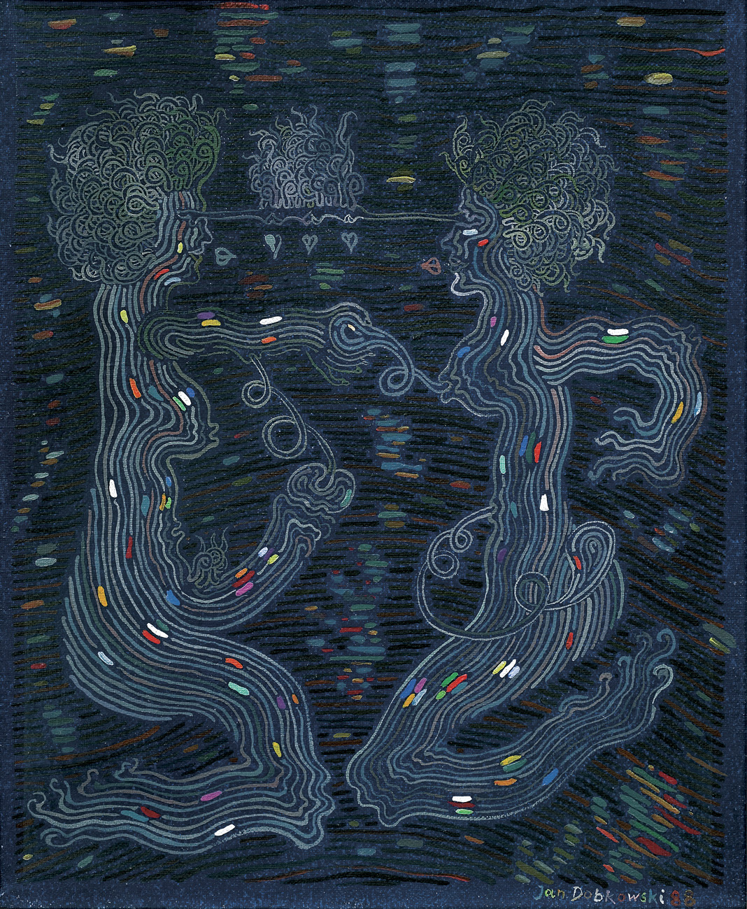 Jan Dobkowski (Łomża 1942, mieszka w Warszawie) studiował w latach 1962-1968 na Wydziale Malarstwa warszawskiej ASP pod kierunkiem prof. Juliusza Studnickiego i Jana Cybisa. Będąc jeszcze na studiach, w 1966, utworzył duet artystyczny, w którym jego partnerem był Jerzy (Jurry) Zieliński. Ich pierwsza wspólna wystawa pn. Neo-Neo-Neo odbyła się w Warszawie w 1967. Wystawiali wspólnie do 1970. W 1968 powstały pierwsze zielono-czerwone obrazy Dobkowskiego (używającego w tym czasie pseudonimu Dobson). W pracach tych, operujących giętkimi, falistymi liniami, w których upatrywano wpływów secesji, artysta używał sposobów rodem z op-artu dla wywołania złudzeń optycznych (wirowanie, mżenie, pozorny ruch form). Równolegle z obrazami tworzył też formy z płyt i folii do montowania w przestrzeni. Złoty medal na Sympozjum Złotego Grona w Zielonej Górze w 1971 i blisko roczny pobyt w USA na stypendium Fundacji Kościuszkowskiej w 1972 to kolejne etapy pełnej sukcesów kariery malarza. Wyraźną zmianę nastroju i wymowy jego prac przyniosły wydarzenia 1980-1981 roku, zwłaszcza wprowadzenie stanu wojennego. Monochromatyczne, ciemne płótna znaczył wtedy nikłymi, wiotkimi liniami rysunku. Najczęstszym motywem były patriotyczne i religijne symbole, dopowiadane tytułami nawiązującymi do realiów czasu. Kolejna radykalna zmiana nastąpiła ok. 1990. Symbolicznym zwiastunem nowego okresu stał się olbrzymi, radosny, eksplodujący bogactwem barw, kształtów i ruchu obraz ...a życie sobie płynie... (394 x 588 cm) z 1990-1991. Podobne cechy formalne charakteryzują twórczość artysty w całej dekadzie lat 90. Równolegle z malarstwem Dobkowski pracuje nad rysunkiem, będącym bardzo ważnym dopełnieniem jego twórczości.