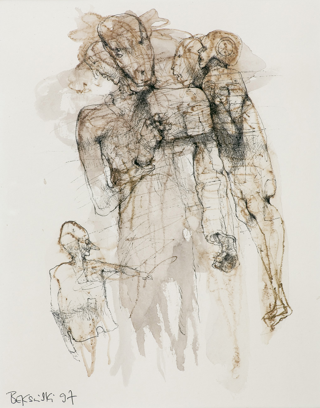 Zdzisław Beksiński (Sanok 24 II 1929 - Warszawa 21 II 2005) studiował w latach 1947-1952 na Wydziale Architektury Politechniki Krakowskiej. Był artystą samoukiem, który osiągnął niekwestionowaną pozycję w polskiej sztuce współczesnej, potwierdzoną obecnością jego prac na prestiżowych wystawach i w kolekcjach muzealnych. Początkowo zajmował się fotografią, którą interesował się od lat studenckich, po 1956 zyskując uznanie jako twórca fotogramów o estetyce opartej o efekty fakturowe. W latach 1958-1962 tworzył abstrakcyjne obrazy-reliefy o bogatej fakturze, głównie metalowe, będące odmianą malarstwa materii. Pod koniec tego okresu powstawały ażurowe formy o kształtach figur i pełnoplastyczne rzeźby w metalu. Kolejnym etapem jego twórczości były lata 1962-1974, kiedy poświęcał się głównie rysunkowi. W latach 60. rysował piórkiem i tuszem figuralne kompozycje odznaczające się karykaturalną deformacją postaci. Od końca lat 60. tworzył rysunki węglem i kredkami, będące monochromatyczną odmianą jego równoległej twórczości malarskiej. Od 1974 zajmował się niemal niepodzielnie malarstwem. Jego charakterystyczny styl bazował na perfekcji technicznej, której towarzyszyła niezwykłość wizji. Malował świat po katastrofie, naznaczony piętnem śmierci i rozpadu. Jego obrazy zaludniają postaci i stwory o ludzkich wprawdzie bądź zwierzęcych kształtach, lecz o cechach fantomów, automatów lub rozpadających się trucheł. Artysta nie nadawał swym obrazom i rysunkom tytułów (poza porządkującymi symbolami), akcentując w ten sposób swój brak zainteresowania dla literackiej strony przedstawień. Sam mówił, że malując całkowicie poddaje się wizji, „fotografuje“ ją. W ostatnich latach włączył do swego warsztatu artystycznego elektroniczne techniki generowania obrazu, które wykorzystywał do tworzenia komputerowych fotomontaży. Sztuka Beksińskiego, wielokrotnie wystawiana i omawiana, budzi skrajne emocje wśród znawców i publiczności.