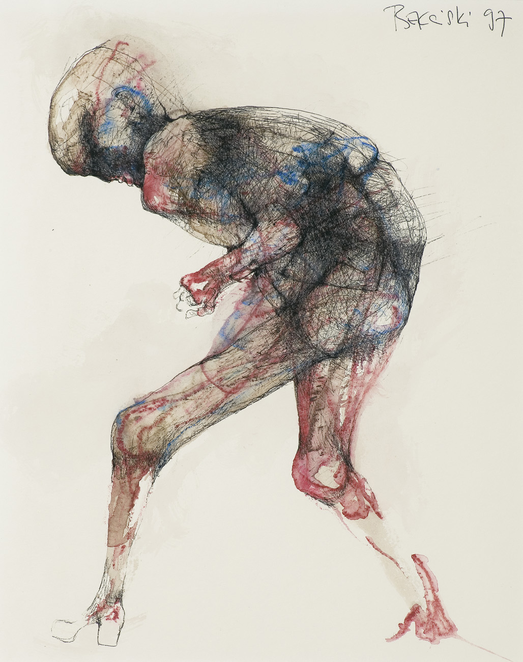 Zdzisław Beksiński (Sanok 24 II 1929 - Warszawa 21 II 2005) studiował w latach 1947-1952 na Wydziale Architektury Politechniki Krakowskiej. Był artystą samoukiem, który osiągnął niekwestionowaną pozycję w polskiej sztuce współczesnej, potwierdzoną obecnością jego prac na prestiżowych wystawach i w kolekcjach muzealnych. Początkowo zajmował się fotografią, którą interesował się od lat studenckich, po 1956 zyskując uznanie jako twórca fotogramów o estetyce opartej o efekty fakturowe. W latach 1958-1962 tworzył abstrakcyjne obrazy-reliefy o bogatej fakturze, głównie metalowe, będące odmianą malarstwa materii. Pod koniec tego okresu powstawały ażurowe formy o kształtach figur i pełnoplastyczne rzeźby w metalu. Kolejnym etapem jego twórczości były lata 1962-1974, kiedy poświęcał się głównie rysunkowi. W latach 60. rysował piórkiem i tuszem figuralne kompozycje odznaczające się karykaturalną deformacją postaci. Od końca lat 60. tworzył rysunki węglem i kredkami, będące monochromatyczną odmianą jego równoległej twórczości malarskiej. Od 1974 zajmował się niemal niepodzielnie malarstwem. Jego charakterystyczny styl bazował na perfekcji technicznej, której towarzyszyła niezwykłość wizji. Malował świat po katastrofie, naznaczony piętnem śmierci i rozpadu. Jego obrazy zaludniają postaci i stwory o ludzkich wprawdzie bądź zwierzęcych kształtach, lecz o cechach fantomów, automatów lub rozpadających się trucheł. Artysta nie nadawał swym obrazom i rysunkom tytułów (poza porządkującymi symbolami), akcentując w ten sposób swój brak zainteresowania dla literackiej strony przedstawień. Sam mówił, że malując całkowicie poddaje się wizji, „fotografuje“ ją. W ostatnich latach włączył do swego warsztatu artystycznego elektroniczne techniki generowania obrazu, które wykorzystywał do tworzenia komputerowych fotomontaży. Sztuka Beksińskiego, wielokrotnie wystawiana i omawiana, budzi skrajne emocje wśród znawców i publiczności.