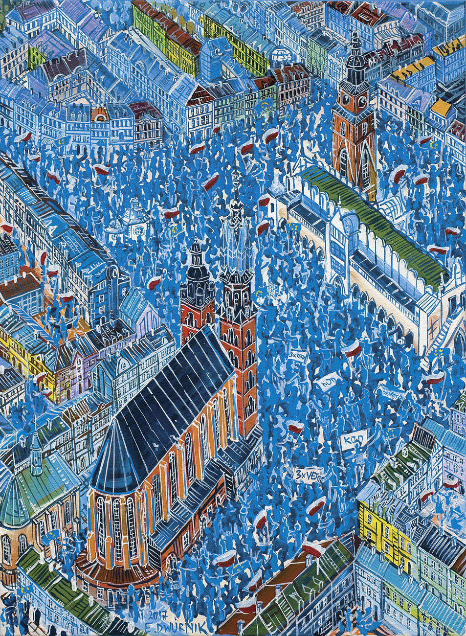 Edward Dwurnik (Radzymin 19 IV 1943 - Warszawa 28 X 2018) studiował malarstwo w ASP w Warszawie (1963-1970), jednak jako swego „mistrza“ wymienia Nikifora. Jego to prace, zobaczone po raz pierwszy w 1965, zainspirowały ówczesnego studenta III roku do narysowania pierwszych prac z cyklu „Podróże autostopem“, które kontynuował w nastepnych latach. W 1972-1978 powstawał cykl „Sportowcy“, w którym portretowane były, dodajmy - kąśliwie, typowe postaci z lat 70. Równolegle od 1975 powstawał cykl „Robotnicy“, który kulminował w okresie „Solidarności“ 1980-1981. Za prace z tego cyklu Dwurnik otrzymał w 1981 Nagrodę Krytyki Artystycznej im. Cypriana Kamila Norwida, natomiast za obrazy z cyklu „Warszawa“ (1981), proroczo zapowiadające stan wojenny - Nagrodę Kulturalną „Solidarności“ podziemnej w 1983. W latach 80. malarstwo Dwurnika przybrało wyraz ekspresyjny i dramatyczny. Powstające w tej dekadzie obrazy miały niejednokrotnie wymowę polityczną, przybierały też kostium historyczny, tak czy inaczej odnoszący się do współczesnych spraw i realiów. Cykl „Droga na Wschód“ (1989-91) upamiętniał ofiary stalinizmu, natomiast cykl „Od Grudnia do Czerwca“ (1990-94) - ofiary stanu wojennego. Zarówno ideowe, jak i czysto malarskie walory tych prac przyniosły artyście ogromne uznanie, zarówno w kraju jak i za granicą. Jego wyrazem była prestiżowa nagroda Fundacji Coutts & Co w Zurychu (1992). W latach 90. powstają cykle będące kontynuacją „Podróży autostopem“: „Niebieskie miasta“ (od 1993) i „Diagonale“ (od 1996), jak również kompozycje nowego typu, jak widoki morskie (cykl „Błękitne“, 1992-93) czy cykl „Wyliczanka“ (1996-99). Artysta wiele wystawia, miał ok. 100 wystaw indywidualnych w Polsce i za granicą, brał też udział w licznych wystawach i festiwalach krajowych i międzynarodowych, m.in.: X Biennale Sztuki Współczesnej, Menton 1974, Documenta 7, Kassel 1982, 5th Biennale, Sydney 1985, XIX Biennale Sztuki, Sao Paulo 1987; Olimpiada Sztuki, Seul 1988. Równolegle z malarstwem uprawiał rysunek, collage, grafikę warsztatową (litografia, techniki metalowe, kserografia, stemple) i użytkową (ilustracja, plakaty do własnych wystaw indywidualnych).