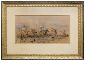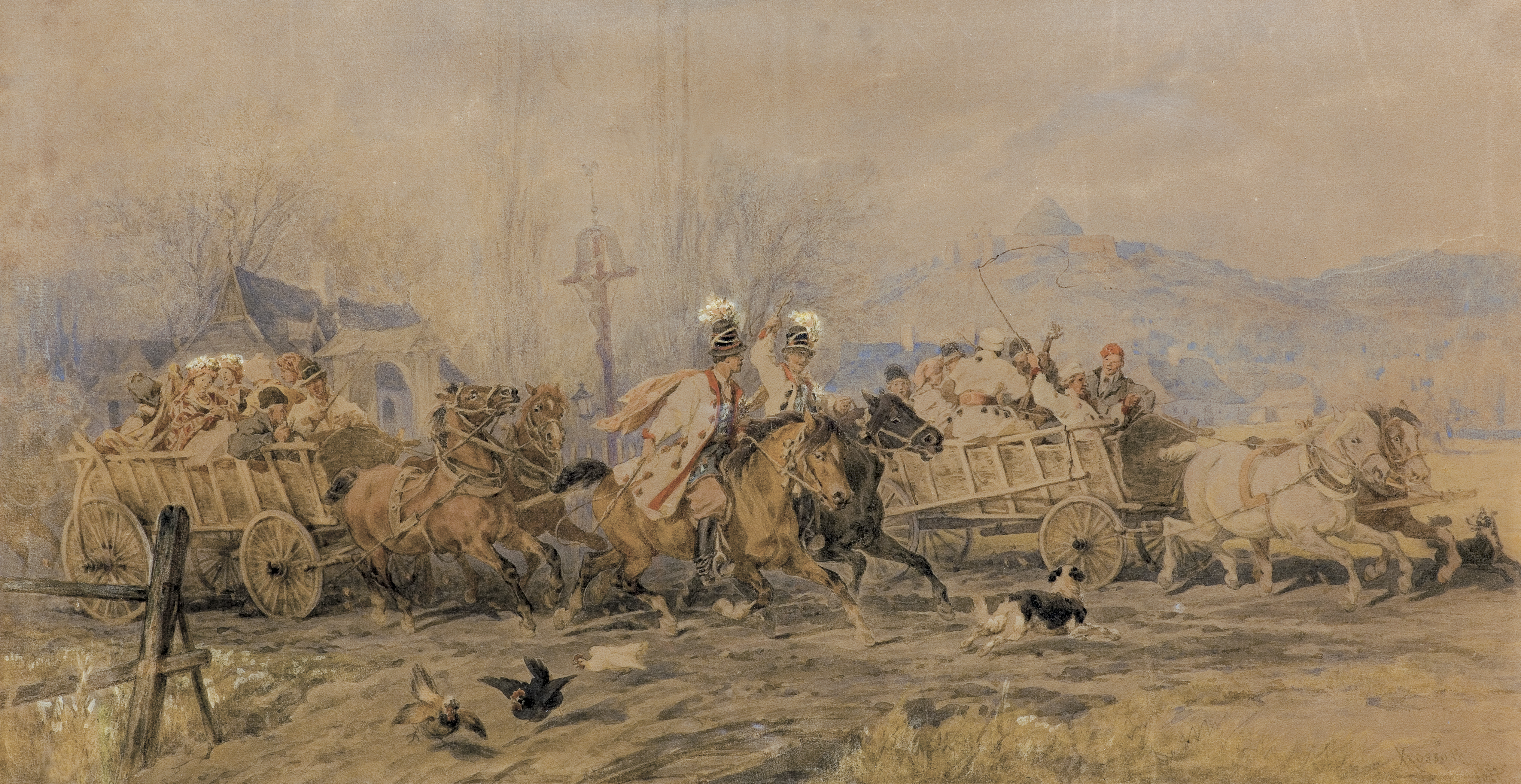 Juliusz Kossak (Wiśnicz 1824 - Kraków 1899) - malarz i ilustrator - był jednym z najpopularniejszych artystów polskich 2. połowy XIX wieku. Naukę rysunku i malarstwa rozpoczął we lwowskiej pracowni Jana Maszkowskiego; później wiele rysował z natury odwiedzając majątki szlacheckie na Ukrainie, Podolu i Wołyniu. W roku 1852 był w Wiedniu, na Węgrzech i w Petersburgu, a następnie zamieszkał na stałe w Warszawie. Lata 1856-1860 spędził w Paryżu, gdzie przyjaźnił się z Horacem Vernetem. Powróciwszy do Warszawy w latach 1862-1868 był kierownikiem artystycznym „Tygodnika Ilustrowanego”. W roku 1869 przeniósł się na stałe do Krakowa, skąd wyjeżdżał jeszcze do Monachium, by malować w atelier batalisty Franza Adama. Kossak był przede wszystkim znakomitym akwarelistą; rzadziej posługiwał się techniką olejną. Malował obrazy historyczne i batalistyczne, sceny rodzajowe ilustrujące życie i tradycje dworu szlacheckiego oraz obyczaje polskiego ludu. Ale prawdziwymi bohaterami jego obrazów były konie, których ruch, temperament, charakter i indywidualność potrafił po mistrzowsku przedstawić. Był także autorem wielu ilustracji do czasopism i książek, trafiającym bezbłędnie tak w klimat utworów literackich, jak i w tęsknoty i potrzeby odbiorców - czytelników Pieśni o ziemi naszej Wincentego Pola, Trylogii Henryka Sienkiewicza, Pana Tadeusza i poematów Adama Mickiewicza.