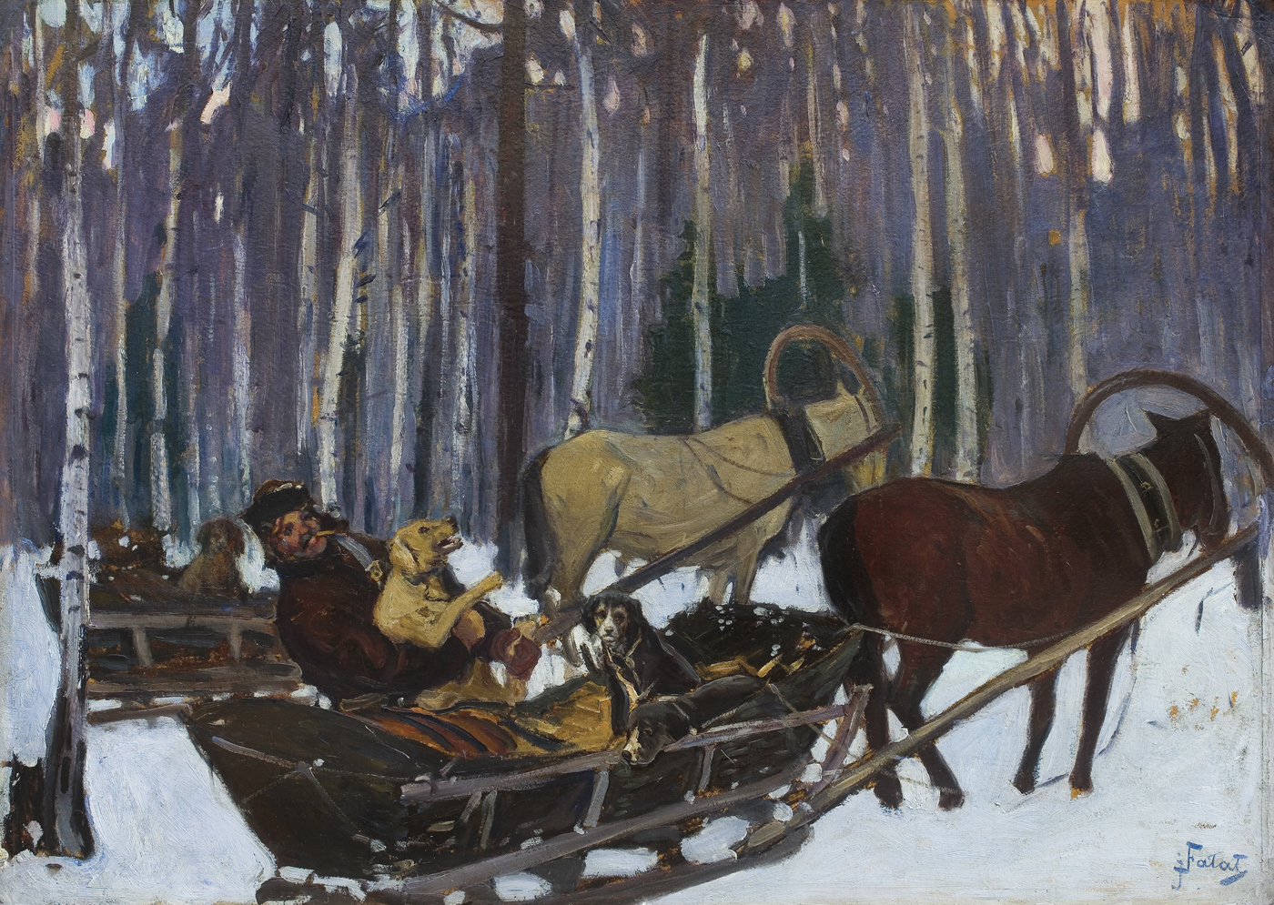 Julian Fałat (Tuligłowy [okręg lwowski] 1853 - Bystra k. Bielska 1929) - malarz i pedagog - jeden z najwybitniejszych artystów polskich okresu przełomu XIX i XX wieku, członek polskich i europejskich stowarzyszeń twórczych oraz Królewskiej Akademii Sztuk Pięknych w Berlinie, wielokrotnie odznaczany medalami na wystawach międzynarodowych. Studiował malarstwo u Władysława Łuszczkiewicza i Leona Dembowskiego w Szkole Sztuk Pięknych w Krakowie (1868-71 i 1881) i w Akademii Sztuk Pięknych w Monachium u Alexandra Strähubera i Johana Leonhardta Raaba (1877-80). Po studiach spędził kilka miesięcy w Rzymie, w 1884 był w Paryżu i w Hiszpanii, a w 1885 odbył podróż morską dookoła świata. W 1886 podczas polowania u ks. Radziwiłłów w Nieświeżu poznał późniejszego cesarza Niemiec Wilhelma II - dla którego następnie w latach 1886-95 pracował w Berlinie jako malarz nadworny. W latach 1894-96 współpracował z Wojciechem Kossakiem przy panoramie Berezyna. W 1895 został powołany na stanowisko dyrektora Szkoły Sztuk Pięknych w Krakowie, w której gruntownie zreformował system nauczania, przekształcając tę uczelnię w nowoczesną Akademię Sztuk Pięknych (r.1900). Do roku 1910 był rektorem Akademii; po przejściu na emeryturę osiadł w miejscowości Bystra k. Bielska. Znakomity akwarelista, malował także olejno. We wcześniejszym okresie tworzył w konwencji realistycznej, z czasem rozjaśnił i wzbogacił paletę, a w akwarelach wprowadzał rozlewną plamę barwną. Zasłynął jako malarz scen myśliwskich rozgrywających się najczęściej w zimowej scenerii; malował też pejzaże, wiejskie sceny rodzajowe, portrety, widoki miejskie.