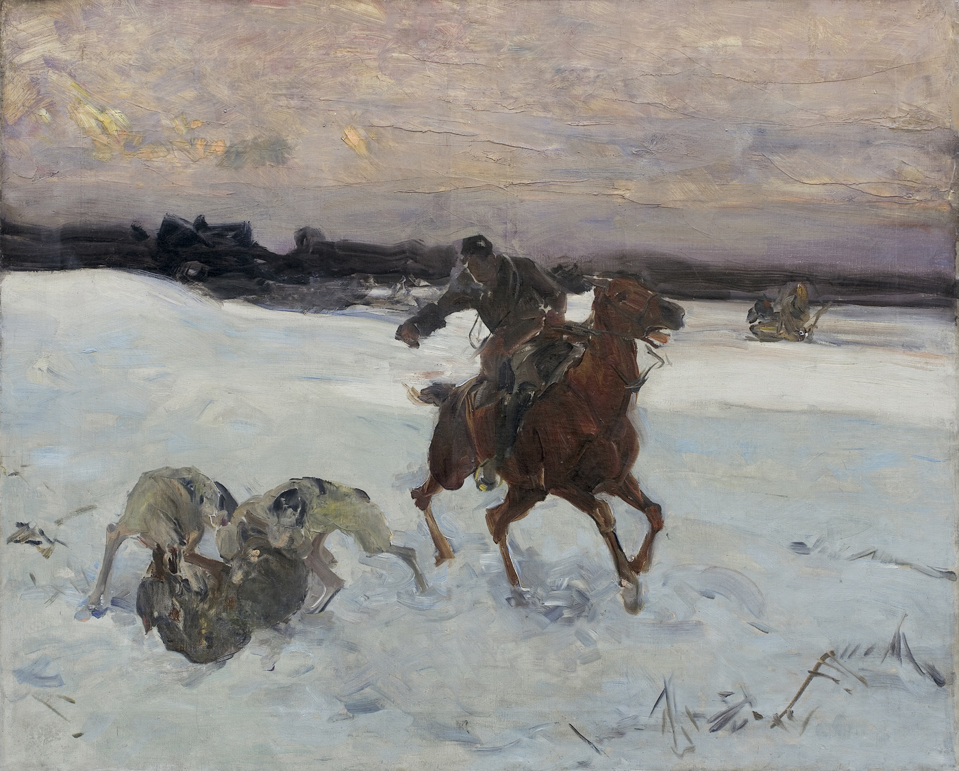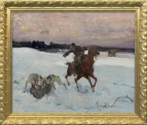 Alfred Wierusz-Kowalski (Suwałki 1849 – Monachium 1915) - jeden z najwybitniejszych polskich malarzy tzw. szkoły monachijskiej był, obok Józefa Brandta i Władysława Czachórskiego, także najpopularniejszym z polskich artystów osiadłych i stale działających w Monachium. Zamieszkał tam w roku 1873, już po studiach w Warszawie i w Dreźnie. Przez rok uczył się jeszcze w monachijskiej Akademii Sztuk Pięknych pod kierunkiem Alexandra Wagnera, a następnie przeniósł się do prywatnej pracowni Brandta. Uznanie krytyki i publiczności zdobył wcześnie; jego obrazy, odznaczane medalami na wystawach były rozchwytywane przez kolekcjonerów i niemieckich handlarzy. W roku 1890 został honorowym profesorem Akademii monachijskiej. Malował sceny rodzajowe i rodzajowo-historyczne z motywami jeźdźców, rycerzy, myśliwych, koni, wilków i śniegów. Po podróży do Afryki w roku 1903 podejmował też tematy orientalne. W polskich zbiorach muzealnych znalazło się stosunkowo niewiele prac artysty – jego obrazy sprzedawane głównie na rynku niemieckim w większej liczbie trafiały do kolekcji prywatnych, głównie w Niemczech i Stanach Zjednoczonych. Obecne często pojawiają się i na polskim rynku sztuki, zawsze budząc zainteresowanie kolekcjonerów.