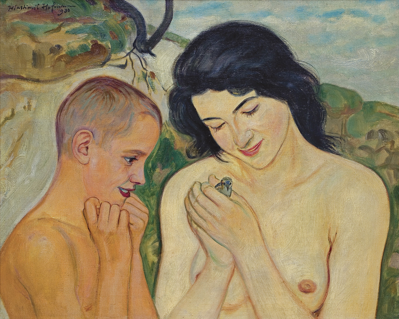 Wlastimil Hofman / Vlastimil Hofmann (Praga 1881 - Szklarska Poręba 1970) studiował w krakowskiej Szkole Sztuk Pięknych - początkowo pod kierunkiem Floriana Cynka, później także u Jana Stanisławskiego, Leona Wyczółkowskiego i Jacka Malczewskiego. W latach 1899-1902 uczył się jeszcze u Jeana Léona Gérôme’a w paryskiej École des Beaux-Arts. W czasie I wojny światowej przebywał w Pradze i w Paryżu; od 1920 stale mieszkał w Krakowie. Dużo wystawiał; należał do wielu stowarzyszeń twórczych - był współzałożycielem „Grupy Pięciu” (1905) i „Grupy Zero” (1908), członkiem Związku Artystów Czeskich „Manes”, a od 1911 członkiem Tow. Artystów Polskich „Sztuka”. W czasie II wojny światowej poprzez ZSRR i Turcję przedostał się do Jerozolimy, skąd w roku 1946 wrócił do Krakowa. Od roku 1947 stale mieszkał w Szklarskiej Porębie. Hofman malował przede wszystkim fantastyczno-symboliczne kompozycje o motywach ludowych oraz sceny rodzajowe, portrety i pejzaże. Jego obrazy mimo bliskich analogii i powiązań ze sztuką Malczewskiego odznaczają się zawsze indywidualnym charakterem, stylem i nastrojem.