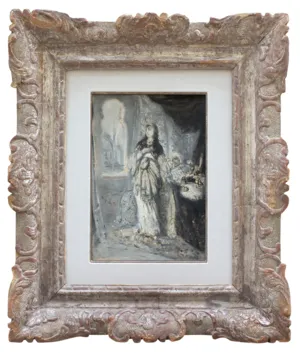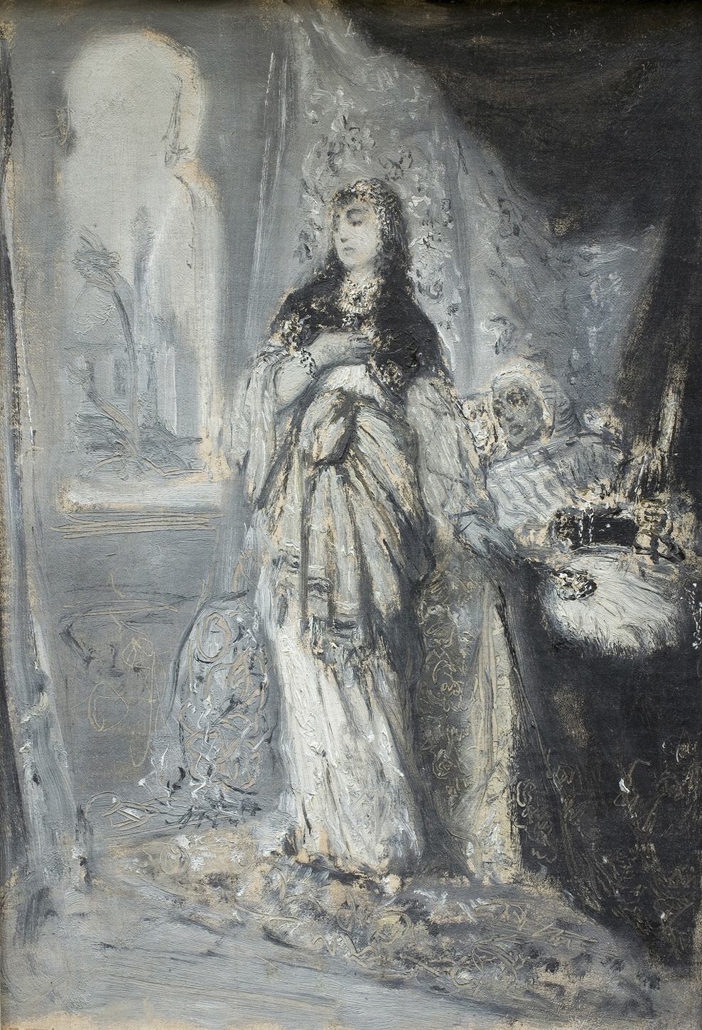 Jednym z tych ostatnich jest także oferowany szkic do Rechy, namalowany olejno na płótnie naklejonym na tekturę (w katalogach i na stronach internetowych spotykane jest także – błędne – określenie techniki, jako „gwasz na tekturze“) Dodatkowo artysta użył tu jeszcze trzonka pędzla, żłobiąc ornamentalne linie w mokrej, świeżej farbie.