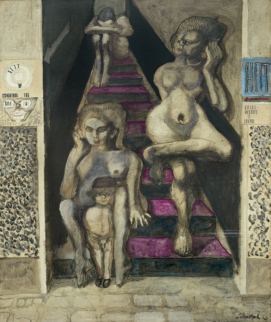 Jan Lebenstein (Brześć Litewski 1930 - Kraków 1999) w latach 1948-1954 studiował malarstwo w ASP w Warszawie pod kierunkiem prof. Eugeniusza Eibischa i Artura Nachta-Samborskiego. W 1955 wziął udział w wystawie w warszawskim Arsenale. Zaprzyjaźniony w czasie studiów z Mironem Białoszewskim, swą pierwszą wystawę indywidualną pokazał w 1956 w Teatrze na Tarczyńskiej. W 1959 zdobył Grand Prix de la Ville de Paris na I Biennale Młodych w Paryżu i w tym roku przeniósł się na stałe do Paryża. Po seriach "figur kreślonych" (na papierze milimetrowym) i "figur hieratycznych" z lat 1955-1958 maluje cykl "figur osiowych" (1958-1962), które wystawia w Paryżu i USA. Równolegle w 1960 zaczyna rysowane "karnety", rodzaj dziennika, który w przyszłości dostarczy motywów wykorzystanych w obrazach. W latach 1964-1965 maluje "Bestiarium", cykl fakturowych, archaizowanych stworów przypominających prehistoryczne wykopaliska. Bezpośrednio po nich wprowadza do swych obrazów postaci ludzkie i fantastyczne, odgrywające sceny ni to mitologiczne, ni to ze snu, często przesycone erotyką. W 1970 projektuje witraże dla Centre du Dialogue w Paryżu. W W 1971 otrzymuje obywatelstwo francuskie 1974 powstają gwasze inspirowane Folwarkiem zwierzęcym George'a Orwella. W latach 1976-1989 tworzy wyłącznie w technice gwaszu i pastelu, podejmując tematykę mitologiczną i zaczerpniętą z Biblii: cykle ilustracji do Księgi Hioba (wyd. 1979) i do Apokalipsy (wyd. 1986) w nowych przekładach Czesława Miłosza. W 1989 powraca do malarstwa olejnego (cykl "Pergamon"). Artysta otrzymał m. in. nagrodę Fundacji im. Alfreda Jurzykowskiego w 1976, Nagrodę Muzeum Archidiecezji Warszawskiej w 1985, Nagrodę im. Jana Cybisa w 1987.