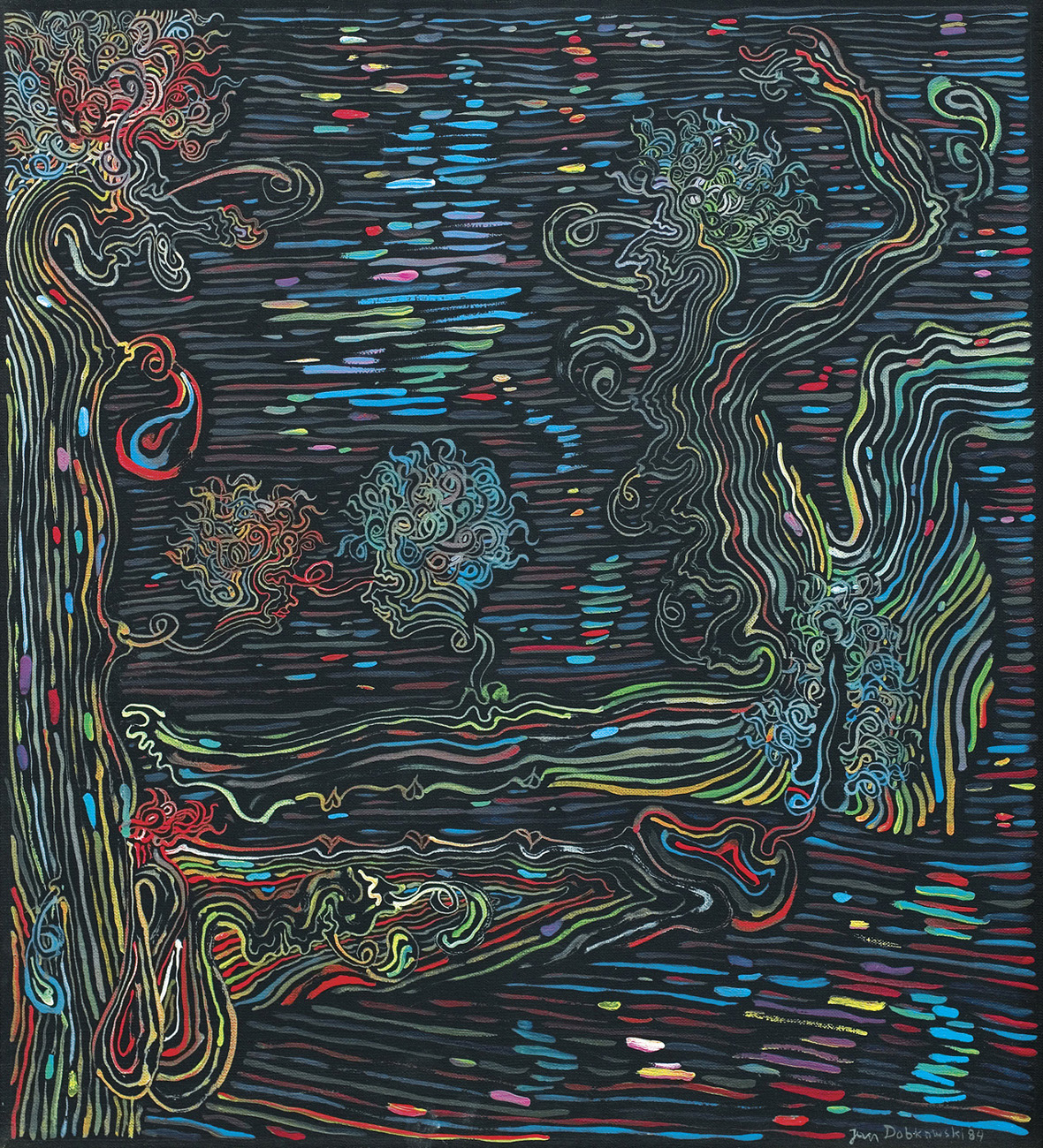 Jan Dobkowski (Łomża 1942, mieszka w Warszawie) studiował w latach 1962-1968 na Wydziale Malarstwa warszawskiej ASP pod kierunkiem prof. Juliusza Studnickiego i Jana Cybisa. Będąc jeszcze na studiach, w 1966, utworzył duet artystyczny, w którym jego partnerem był Jerzy (Jurry) Zieliński. Ich pierwsza wspólna wystawa pn. Neo-Neo-Neo odbyła się w Warszawie w 1967. Wystawiali wspólnie do 1970. W 1968 powstały pierwsze zielono-czerwone obrazy Dobkowskiego (używającego w tym czasie pseudonimu Dobson). W pracach tych, operujących giętkimi, falistymi liniami, w których upatrywano wpływów secesji, artysta używał sposobów rodem z op-artu dla wywołania złudzeń optycznych (wirowanie, mżenie, pozorny ruch form). Równolegle z obrazami tworzył też formy z płyt i folii do montowania w przestrzeni. Złoty medal na Sympozjum Złotego Grona w Zielonej Górze w 1971 i blisko roczny pobyt w USA na stypendium Fundacji Kościuszkowskiej w 1972 to kolejne etapy pełnej sukcesów kariery malarza. Wyraźną zmianę nastroju i wymowy jego prac przyniosły wydarzenia 1980-1981 roku, zwłaszcza wprowadzenie stanu wojennego. Monochromatyczne, ciemne płótna znaczył wtedy nikłymi, wiotkimi liniami rysunku. Najczęstszym motywem były patriotyczne i religijne symbole, dopowiadane tytułami nawiązującymi do realiów czasu. Kolejna radykalna zmiana nastąpiła ok. 1990. Symbolicznym zwiastunem nowego okresu stał się olbrzymi, radosny, eksplodujący bogactwem barw, kształtów i ruchu obraz ...a życie sobie płynie... (394 x 588 cm) z 1990-1991. Podobne cechy formalne charakteryzują twórczość artysty w całej dekadzie lat 90. Równolegle z malarstwem Dobkowski pracuje nad rysunkiem, będącym bardzo ważnym dopełnieniem jego twórczości.