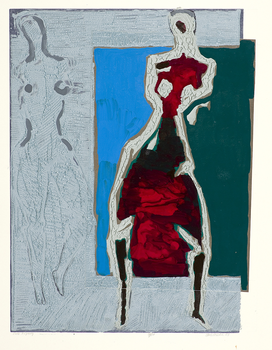 Halina Chrostowska (Warszawa 1929- Warszawa 1990) - pobierała pierwsze nauki pod okiem ojca, Stanisława Ostoja-Chrostowskiego, wybitnego grafika okresu międzywojennego i pierwszego rektora warszawskiej ASP po wojnie. Studiowała malarstwo i grafikę w latach 1946-1950 w tej uczelni. W 1950 rozpoczęła pracę pedagogiczną na Wydziale Grafiki, którą kontynuowała do 1989. Od 1962 prowadziła własną pracownię grafiki warsztatowej, w której wykształciła wielu wybitnych artystów. Równolegle działała w Związku Polskich Artystów Plastyków. Debiutowała w pierwszej połowie lat 50. cyklami akwafort, m. in. „W walce”, „Powstanie Kościuszkowskie”, „Z PGR-u”, nagradzanych na Ogólnopolskich Wystawach Plastyki (1952-1954). W 1955 zdobyła II nagrodę i srebrny medal na Międzynarodowym konkursie i wystawie towarzyszącym V Światowemu Festiwalowi Młodzieży i Studentów w Warszawie. Mimo dominacji doktryny socrealizmu, artystka potrafiła wypracować formułę realizmu dalekiego od polityki, refleksyjnego i wiernego nieupiększonym realiom tych lat. Od około 1956 w jej twórczości górę wzięło zainteresowanie eksperymentami formalnymi i technicznymi. Początkowo tworzyła grafiki czarno-białe, skupiając się na efektach fakturowych (cykle „Astralny” (1957), „Komedianci”, 1961-1963). Łączyła niekiedy matryce metalowe z linorytniczymi i drzeworytniczymi. W 1968 wprowadziła do swych prac kolor, tworząc serie „Portretów” i różnobarwnych „Figur”. Grafiki Chrostowskiej łączyły związki z równoległymi nurtami malarstwa informel, w latach 70. z pop-artem. Od końca lat 50. datują się największe sukcesy artystki na forum krajowym i międzynarodowym. Uczestniczyła m. in. w I Biennale Młodych, Paryż 1959, II Międzynarodowym Biennale Grafiki, Tokio 1960 (gdzie uzyskała nagrodę Muzeum Ohara), VI Biennale Sztuki, Săo Paulo 1961, II Międzynarodowe Biennale Grafiki, Florencja 1970 (złoty medal). Kryzys zdrowotny (nadwerężenie nadgarstków) w 1973 zmusił ją do przejściowego zaniechania forsownej pracy przy grafice. Powstał wtedy rysunkowy cykl „Ręce”, w którym artystka odbijała swe dłonie pokryte farbami. Od 1975 wróciła do grafiki, tworząc kolejne kompozycje z zarzuconych cyklów. Od 1977 wykonywała unikatowe odbitki łączące grafikę z malarstwem i collage'em. W 1986 zapadła na chorobę nowotworową. Od 1988 wprowadziła do swego warsztatu sitodruk i kontynuowała eksperymenty malarskie.