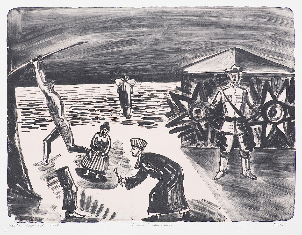 Jarosław Modzelewski (Warszawa 1955, mieszka w Warszawie) studiował malarstwo w ASP w Warszawie w latach 1975-1980, uzyskując dyplom w pracowni Stefana Gierowskiego. Od 1982 pracuje jako pedagog na macierzystym wydziale. W 1982 był współzałożycielem „Gruppy”, najważniejszego ugrupowania nurtu nowej ekspresji lat 80., działającego do 1992. W latach 1991-1996 wspólnie z Markiem Sobczykiem prowadził prywatną Szkołę Sztuki w Warszawie. Od wielu lat współpracuje z Galerią Zderzak w Krakowie. W początkowym okresie twórczości skłaniał się ku abstrakcji, wykorzystywał uproszczone znaki i emblematy oraz sylwetki odbite z szablonu. W 1985 namalował cykl oparty na ilustracjach do podręczników języka rosyjskiego, obrazujący proste czynności, których czasownikowe określenia stanowią tytuły prac. W 1986-1989 powstawały obrazy utrzymane w konwencji realistycznej, jednak zarazem o surrealnej atmosferze uzyskiwanej różnymi metodami, np. przez dublowanie figur, ukazywanie postaci w sytuacji niepewności czy zagrożenia, zabiegi z przestrzenią. W grupie obrazów z 1988 artysta rezygnuje z postaci ludzkiej na rzecz wyjątkowego nasycenia emocją samej przestrzeni pejzaży i wnętrz. Około 1990 wraca do kompozycji akcentujących czynności wykonywane przez postaci, które często umieszczone są w pustej, zaledwie zasugerowanej, acz dominującej przestrzeni. Odrealnienia i monumentalności dodaje tym obrazom płaskie i rozległe kładzenie koloru.