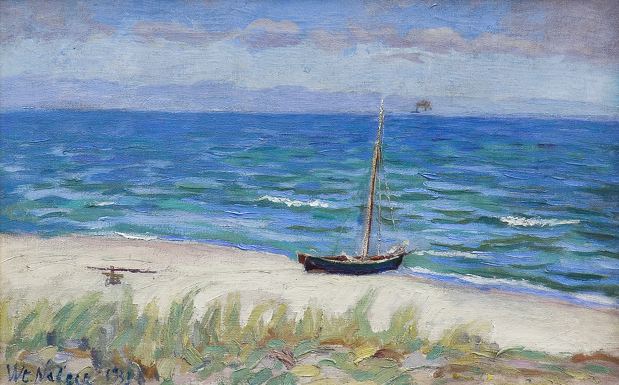 Włodzimierz Nałęcz (Kijów 1865 - Jeruzal k. Skierniewic 1946) studia malarskie w Akademii Sztuk Pięknych w Petersburgu rozpoczął w roku 1885. Kształcił się pod kierunkiem Iwana Ajwazowskiego i Lwa Lagorio. Wyjeżdżał na stypendia do Belgii, Szwecji oraz Norwegii, gdzie malował pod kierunkiem Adelsteena Normanna i Hansa Dahla. Naukę uzupełniał też w Akademii w Düsseldorfie i w Anglii. W 1893 powrócił do Petersburga i ukończył studia z tytułem „kłassnyj chudożnik“ i małym medalem srebrnym. Następnie, do 1899 przebywał w Paryżu. Nałęcz był przede wszystkim pejzażystą. W poszukiwaniu wciąż nowych motywów i inspiracji wyjeżdżał w liczne podróże, malując krajobrazy z wybrzeży Bretanii, Anglii, Szkocji, Skandynawii czy Krymu. Od 1907 stale mieszkał w Warszawie, gdzie był nauczycielem rysunku w Gimnazjum Górskiego. Po zakończeniu I wojny światowej, jako jeden z pierwszych polskich pejzażystów, malował wybrzeża Bałtyku, angażując się w propagowanie polityki morskiej Polski. Od roku 1920 prowadził letnie kursy pejzażu w swojej pracowni w Lisim Jarze koło Rozewia, a w 1922 założył Koło Marynistów Polskich i był jego długoletnim prezesem. Był także literatem; pisywał artykuły z zakresu sztuki oraz marynistyki. Wydał też kilka książek ilustrowanych własnymi rysunkami; wśród "Moje wędrówki artystyczne" (1914), "Na bursztynowym szlaku" (1926), "Album morski" (1930) - wspomnienia ze swych licznych i ciekawych podróży. Był kierownikiem artystycznym czasopisma „Bandera polska“ oraz współtwórcą miesięcznika „Morze“.